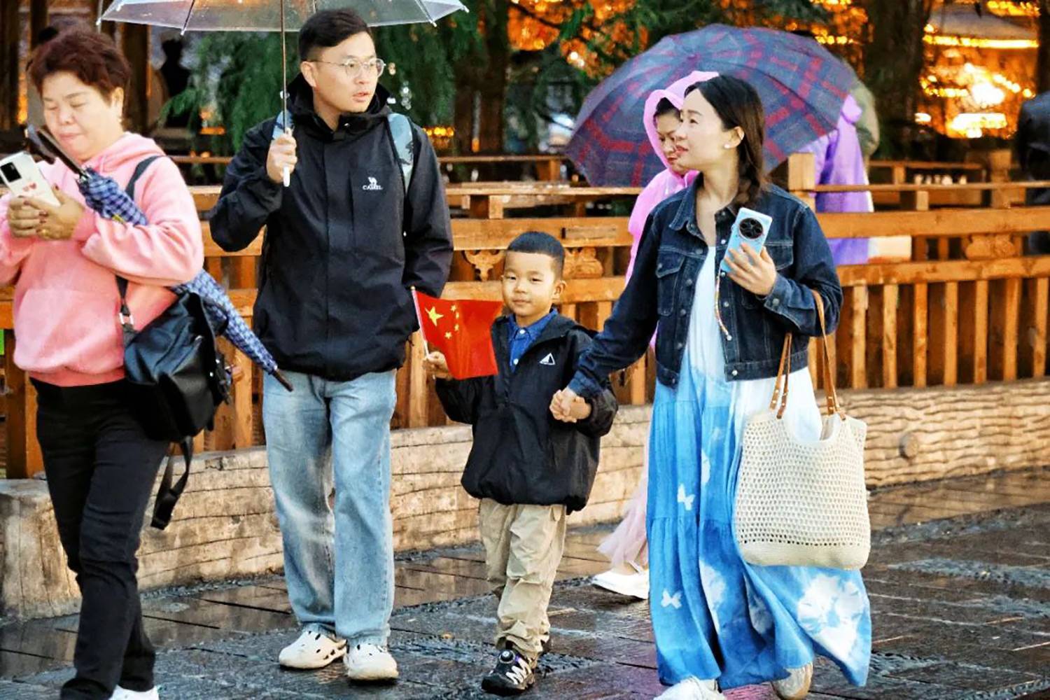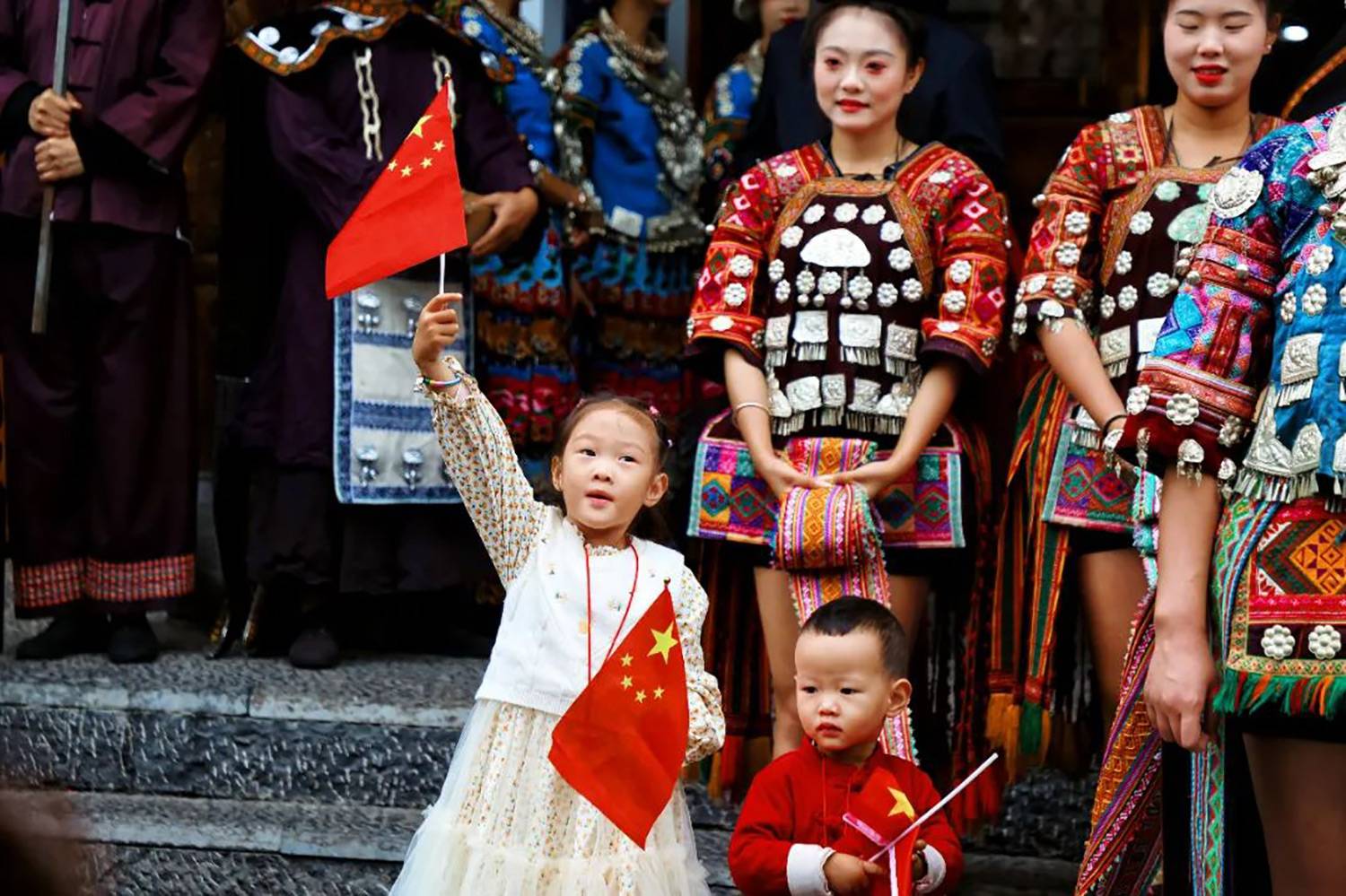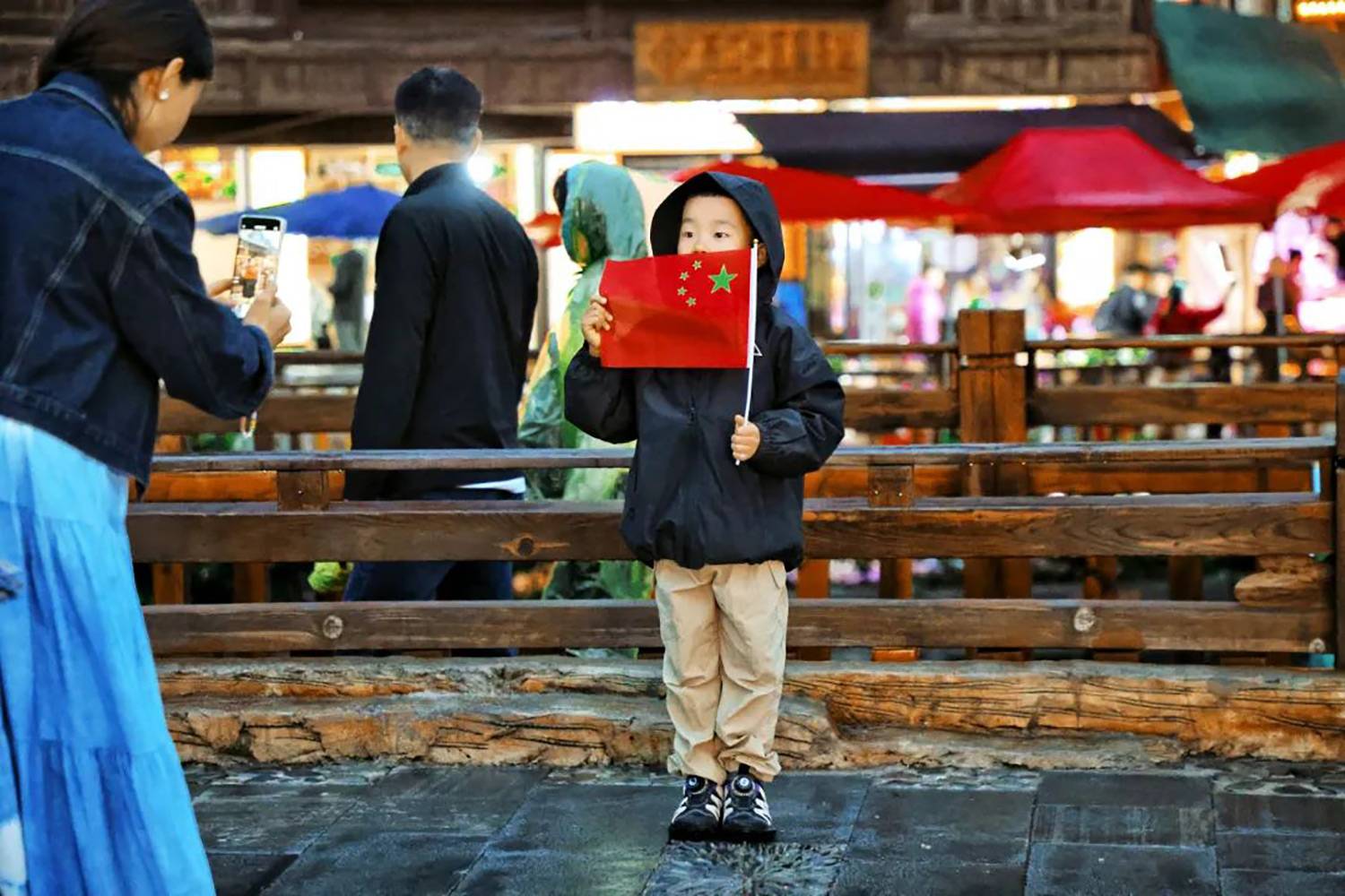 国庆假期来到苗寨的游客小朋友高兴挥舞着五星红旗