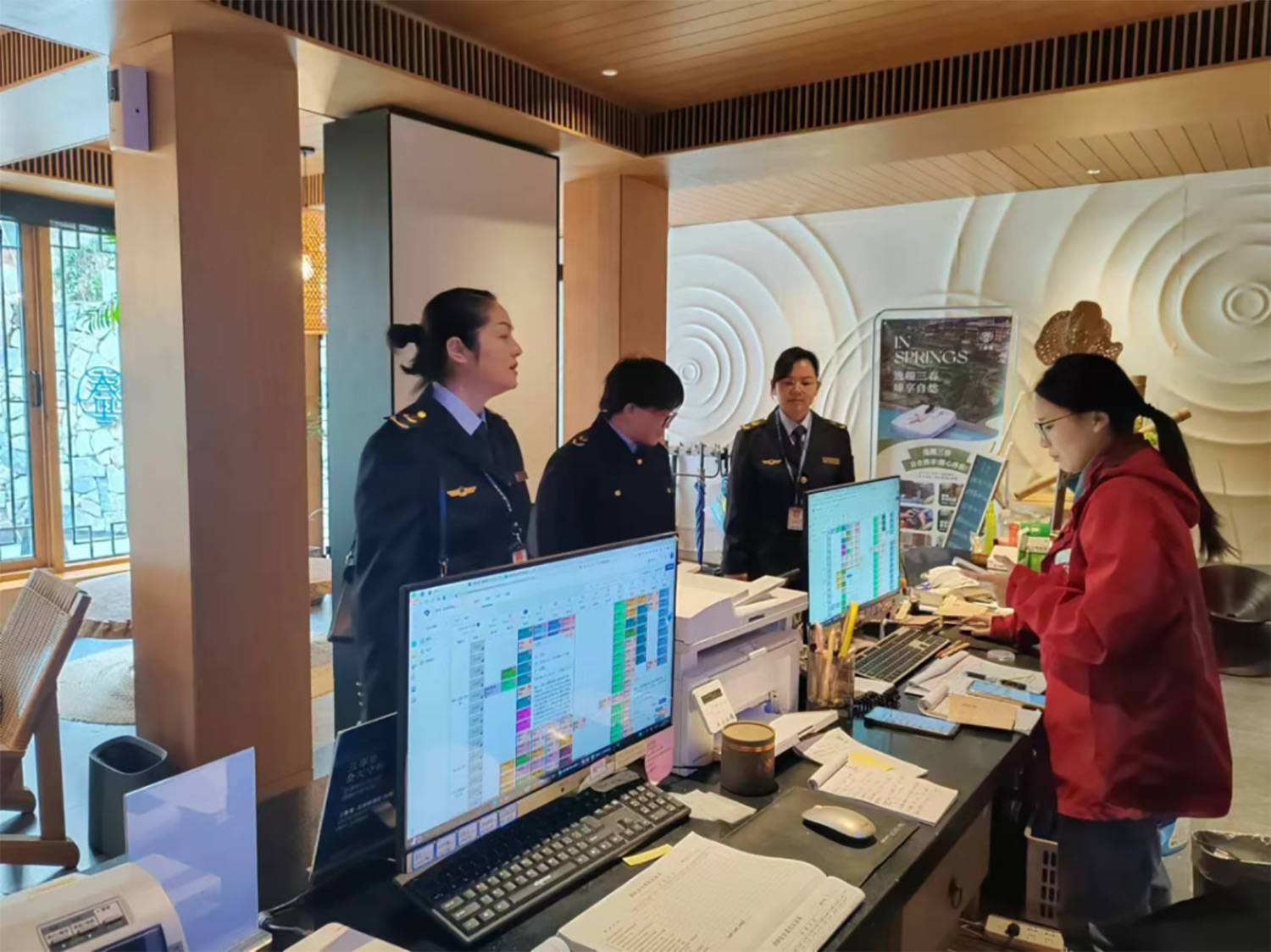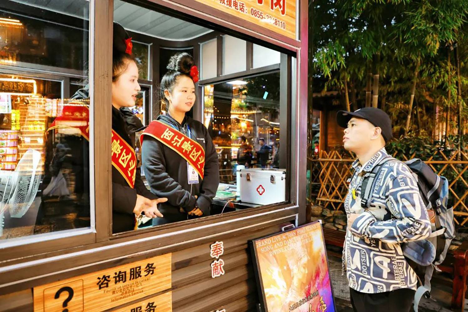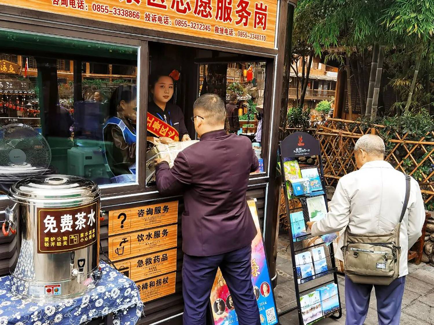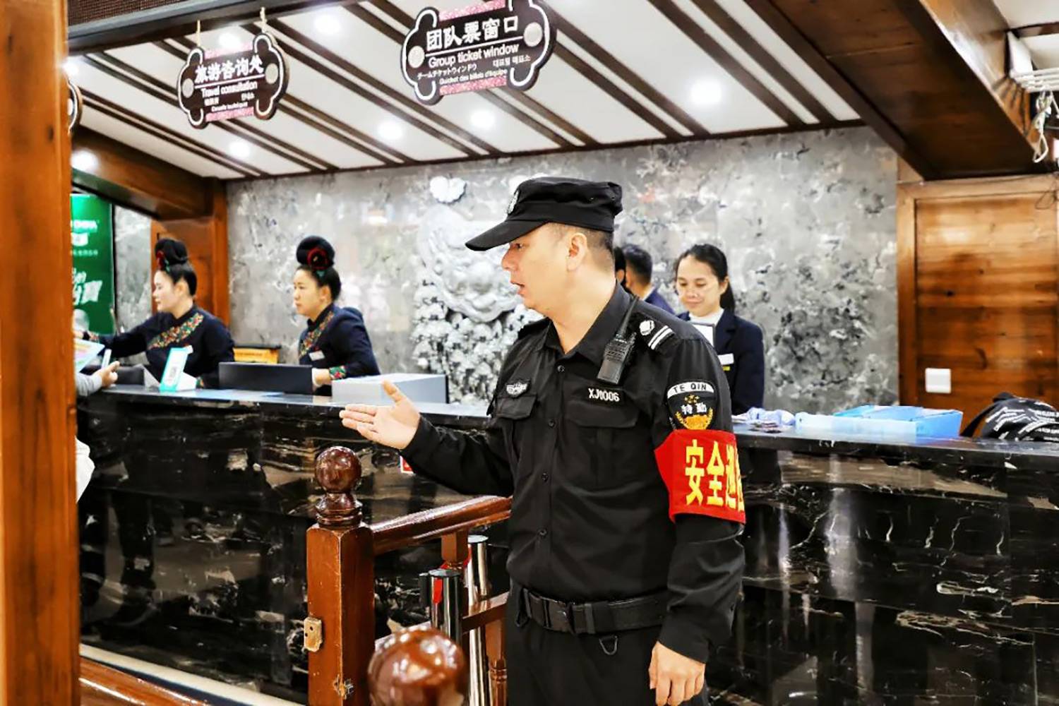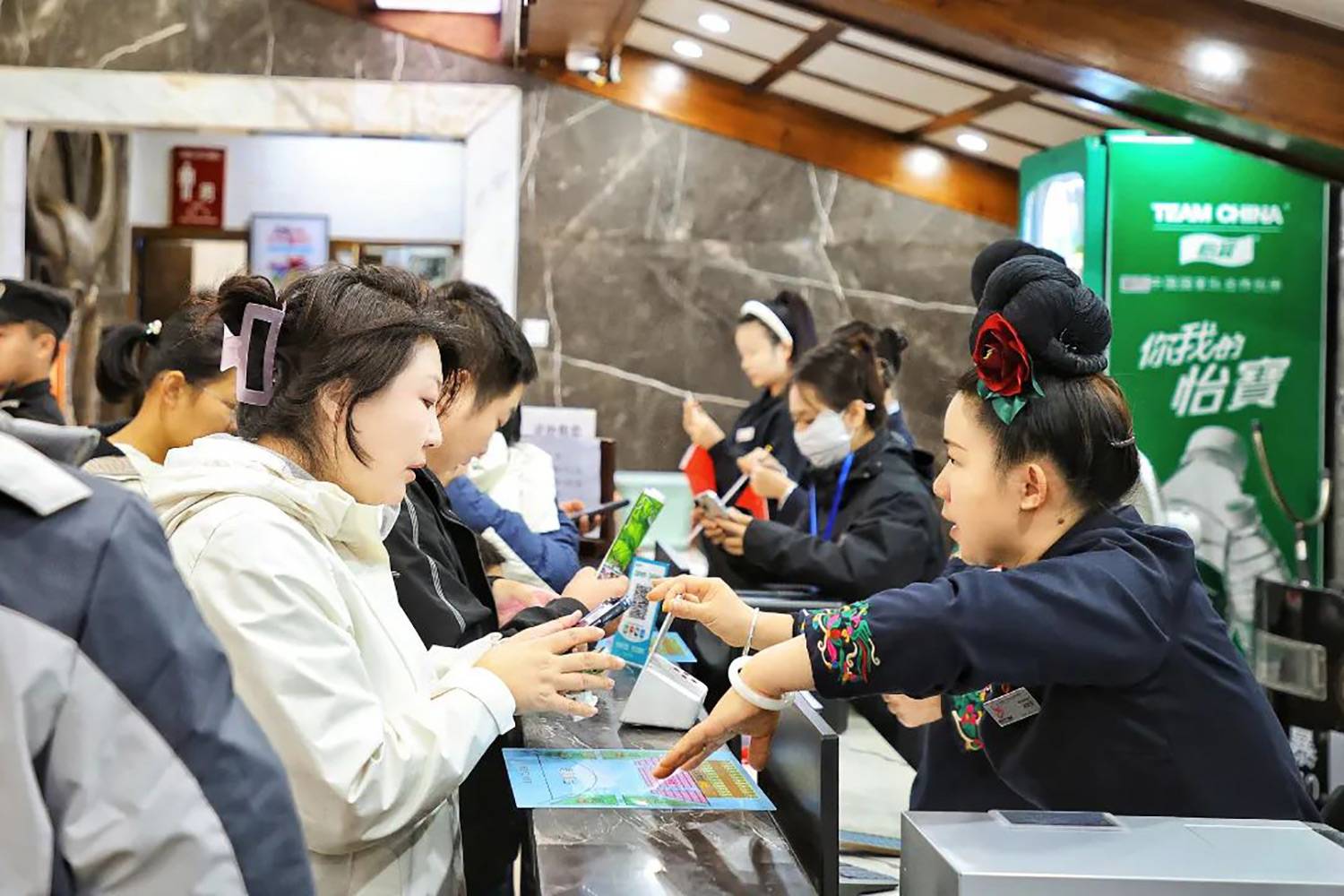 售检票员、咨询员、志愿者等工作人员为游客提供售票检票、线路引导、旅游咨询等服务