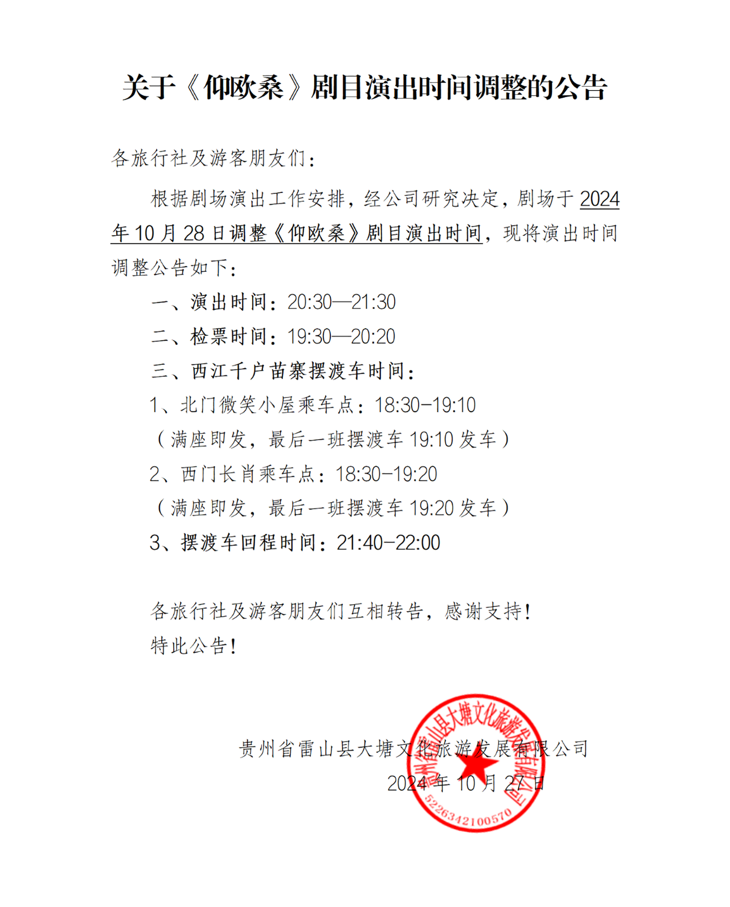 根据剧场演出工作安排,经公司研究决定,剧场于2024年 10月 28日调整《仰欧桑》剧目演出时间,现将演出时间调整公告如下: