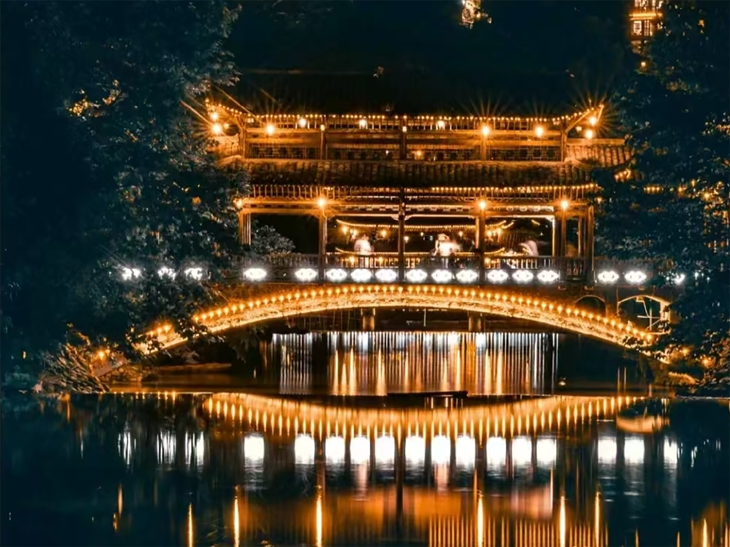 夜幕低垂,万盏灯火逐一亮起,与夜空中闪烁的星辰遥相呼应,便是一幅璀璨的动人画卷,世界先生们在观景台看灯火阑珊下的苗寨,感受木瓦间满载的烟火韵味。