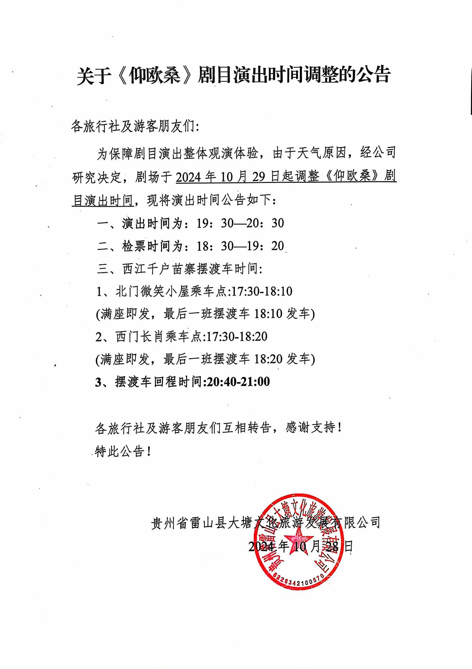 为保障剧目演出整体观演体验,由于天气原因,经公司研究决定,剧场于 2024年10月29日起调整《仰欧桑》剧目演出时间,现将演出时间公告如下: