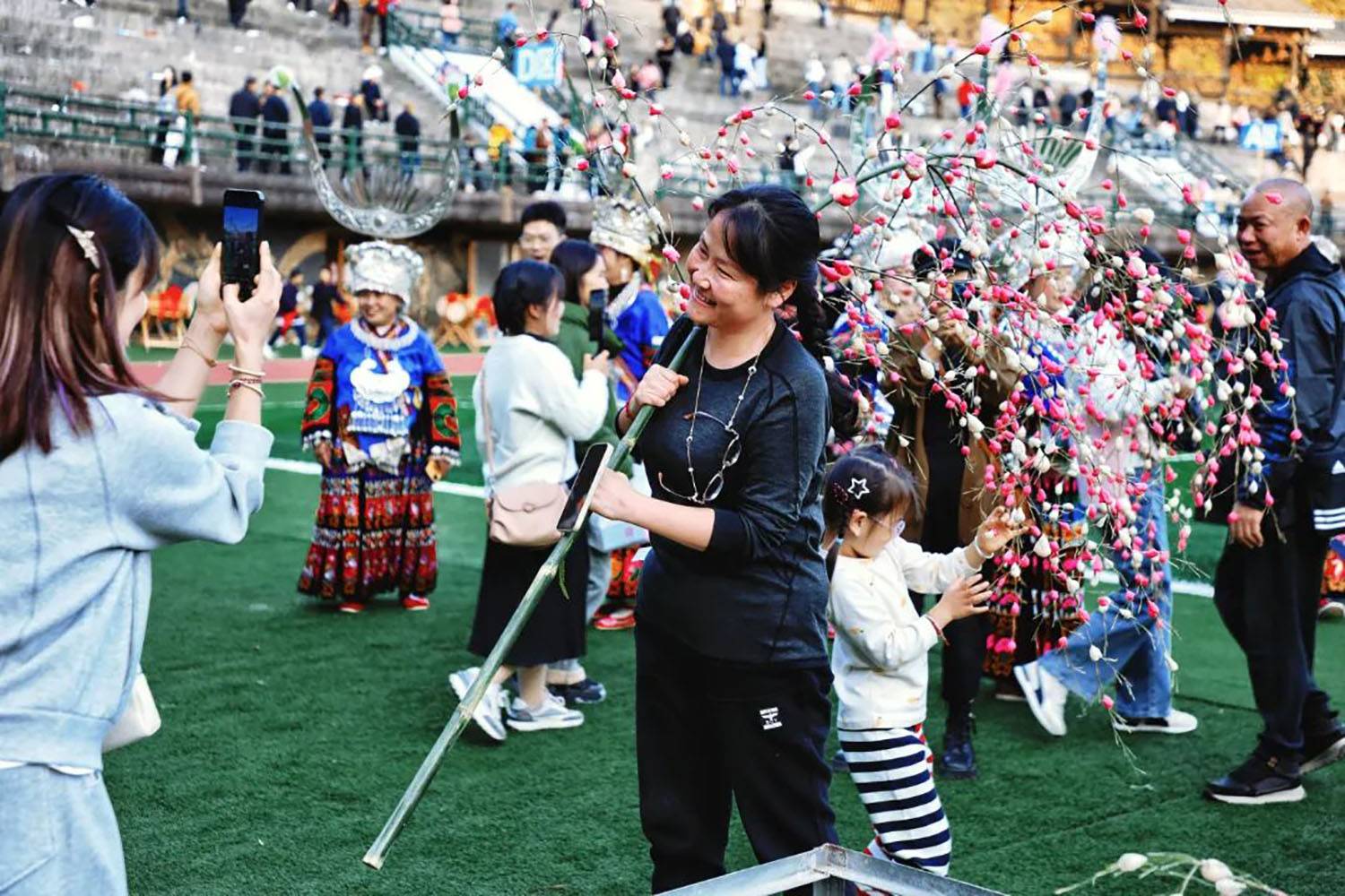 现场还有很多游客与苗家人拍照互动
