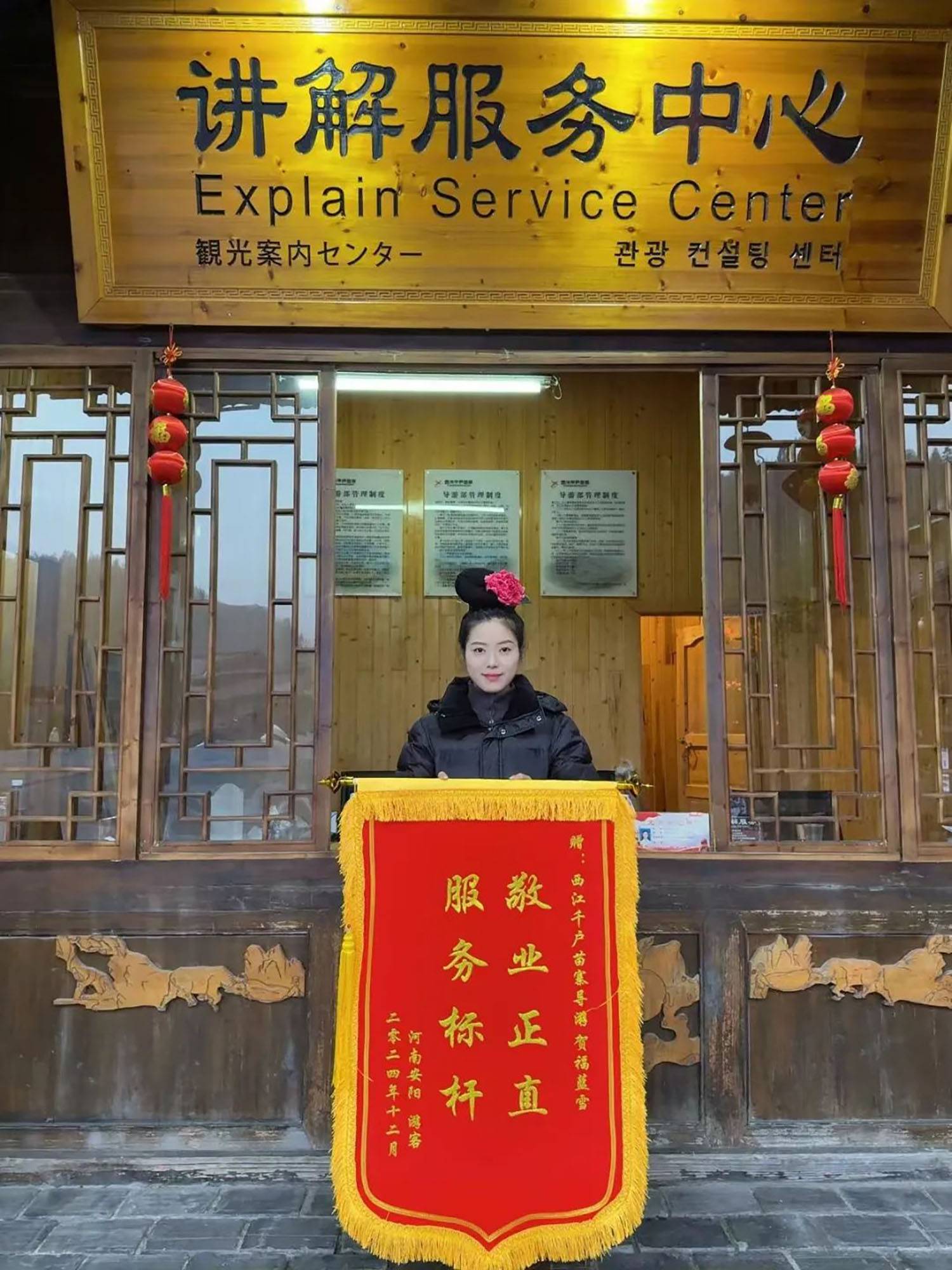 据了解,来自河南安阳的几名游客踏入西江千户苗寨,他们未曾想到,一位叫做贺福蓝雪的讲解员会成为这段旅程中最温暖的遇见。在她脸上总是洋溢着热情的笑容,察觉到游客们舟车劳顿可能兴致不高,于是一路上妙语连珠,用诙谐幽默的语言介绍着所到之处的文化内涵,引得游客们不时捧腹大笑。在讲解员的带动下,原本沉闷的氛围变得轻松愉悦,大家渐渐忘却了烦恼,了解了景区文化也感受到了家的温暖。这段旅途结束后,游客们内心满是感动,第一时间拨通了景区客服电话,激动地说道:“这次旅行因为有这位讲解员而变得无比美好,她用自己的阳光和善良感染了我们,让我们重新找回了快乐!非常感谢西江千户苗寨,为景区点赞!”为了表达这份深深的敬意与谢意,游客们精心定制了一面锦旗,上面印着“敬业正直,服务标杆”,并郑重地送到了景区。