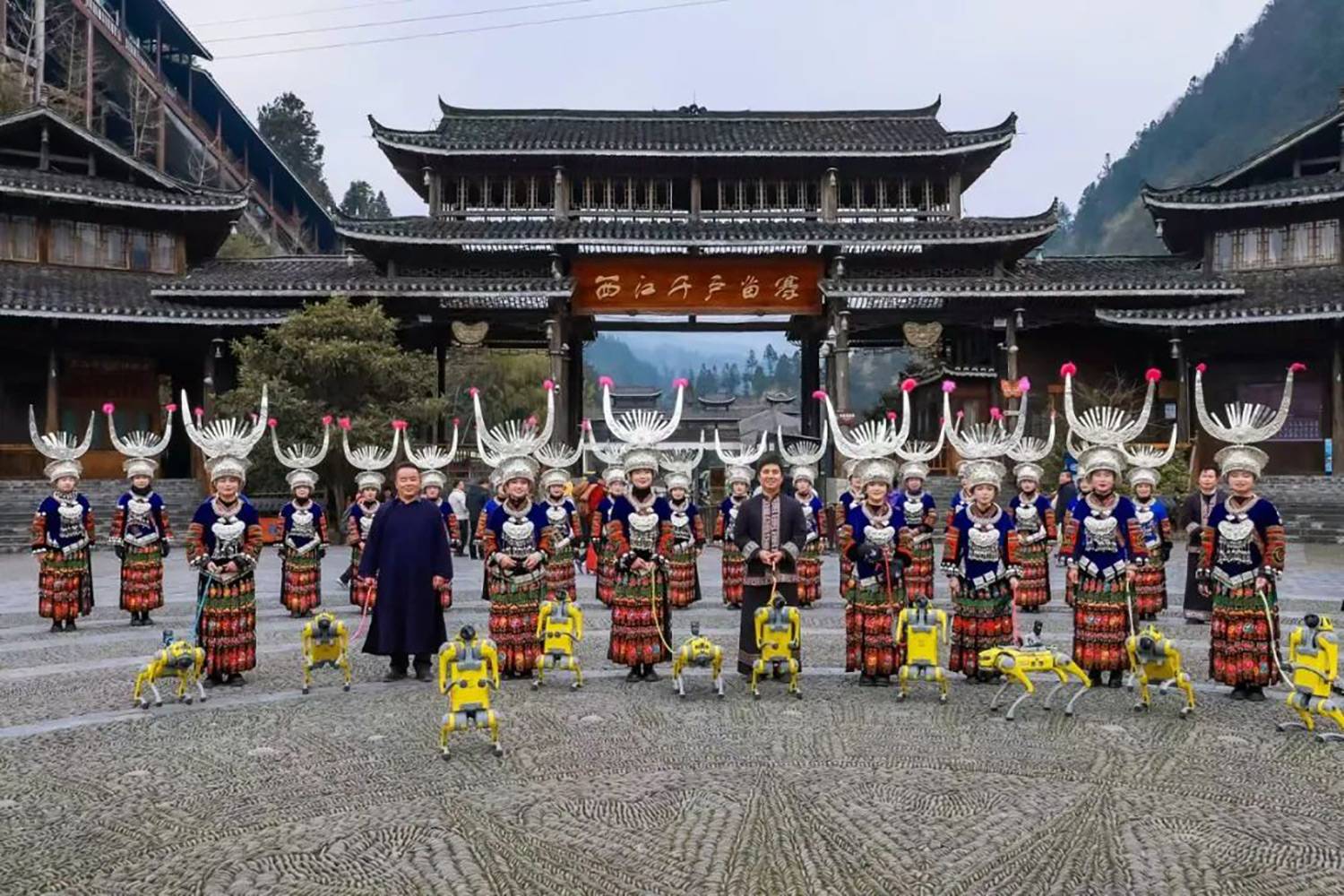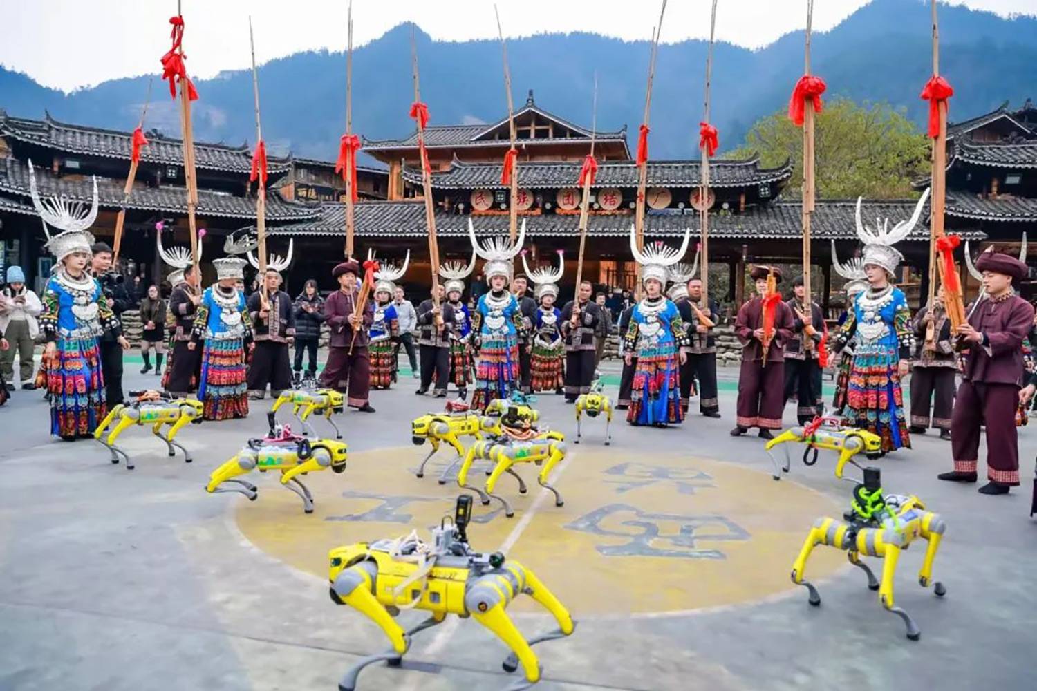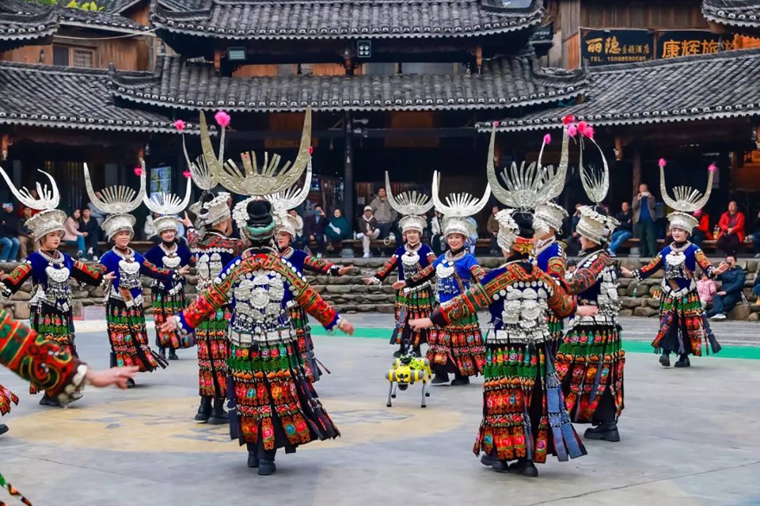 芦笙场上,苗族芦笙舞蹈展演与机器狗跳舞展示更是将活动推向了高潮,悠扬的音乐、热情的舞蹈和科技感十足的机器狗,共同组成了一场别开生面的视觉盛宴。在西江千户苗寨优美的风景下,游客们不仅了解了大量苗族文化知识,也感受到了AI人工智能技术的智能与强大。