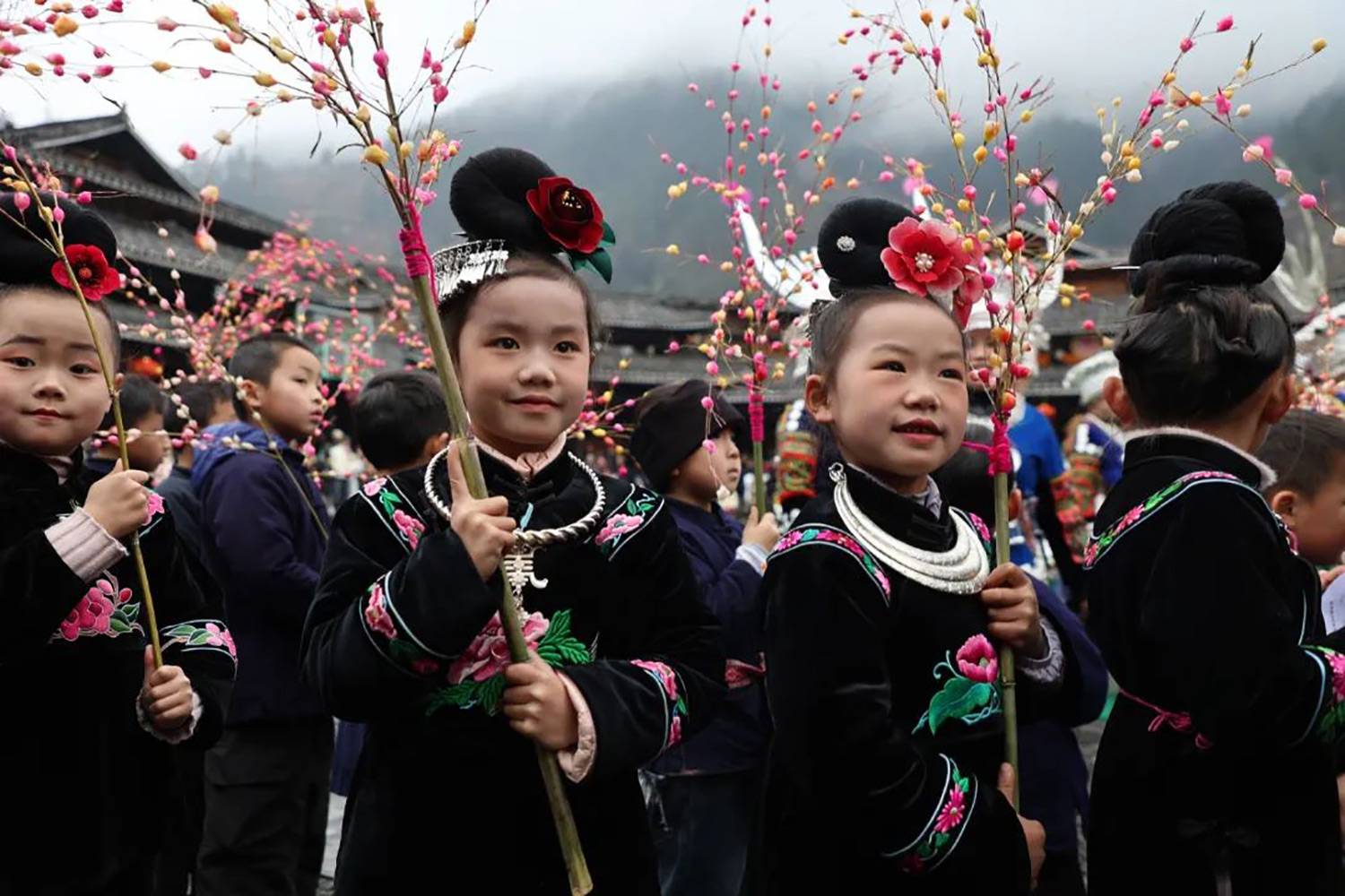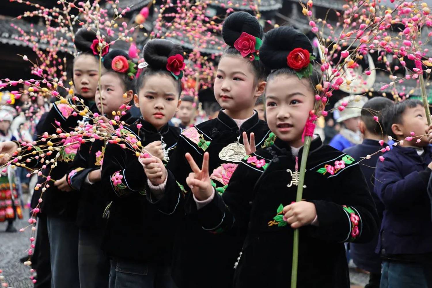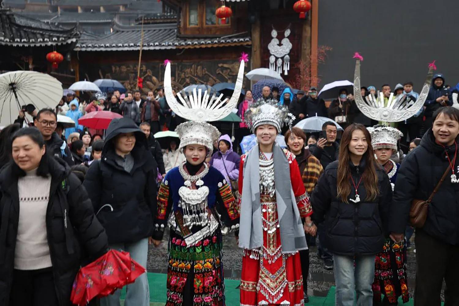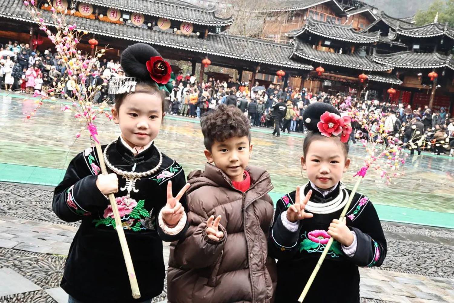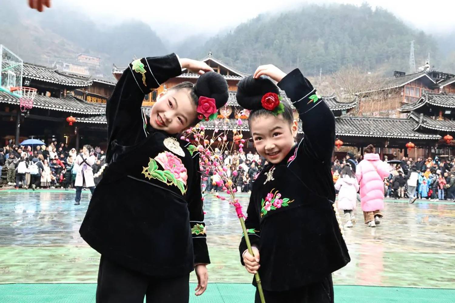 苗娃闹新春,春节童话之旅!大年初四,“苗娃闹新春” 活动在一片欢声笑语中拉开帷幕。身着华丽苗服的萌娃们瞬间成为焦点,巡游队伍沿着苗寨的青石板路缓缓前行,所到之处,吸引了无数游客和村民的目光,纯真笑容将苗族传统韵味诠释得恰到好处。