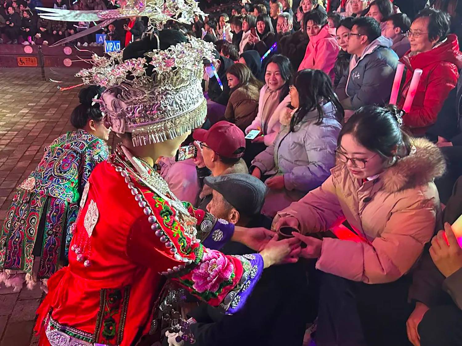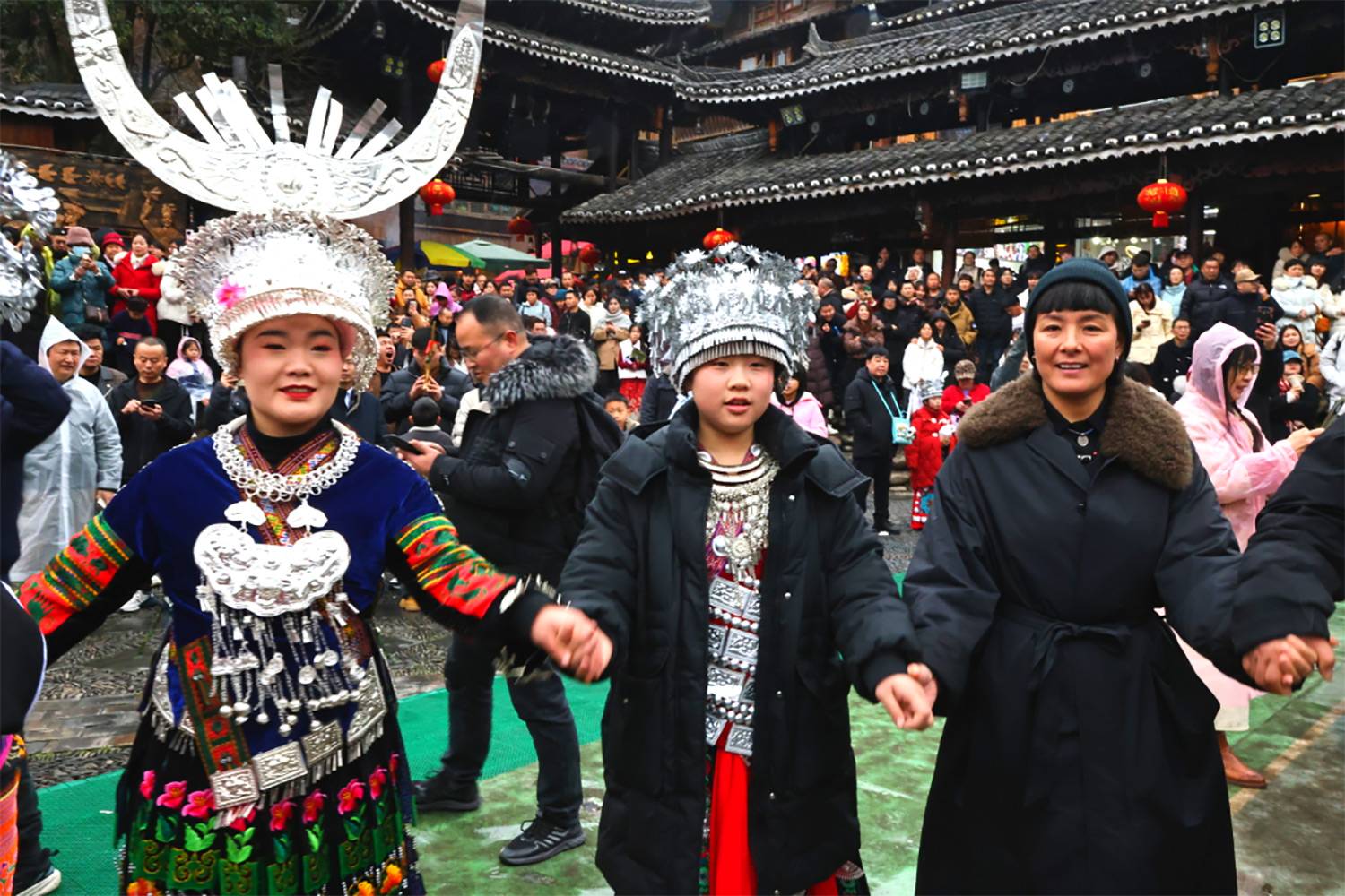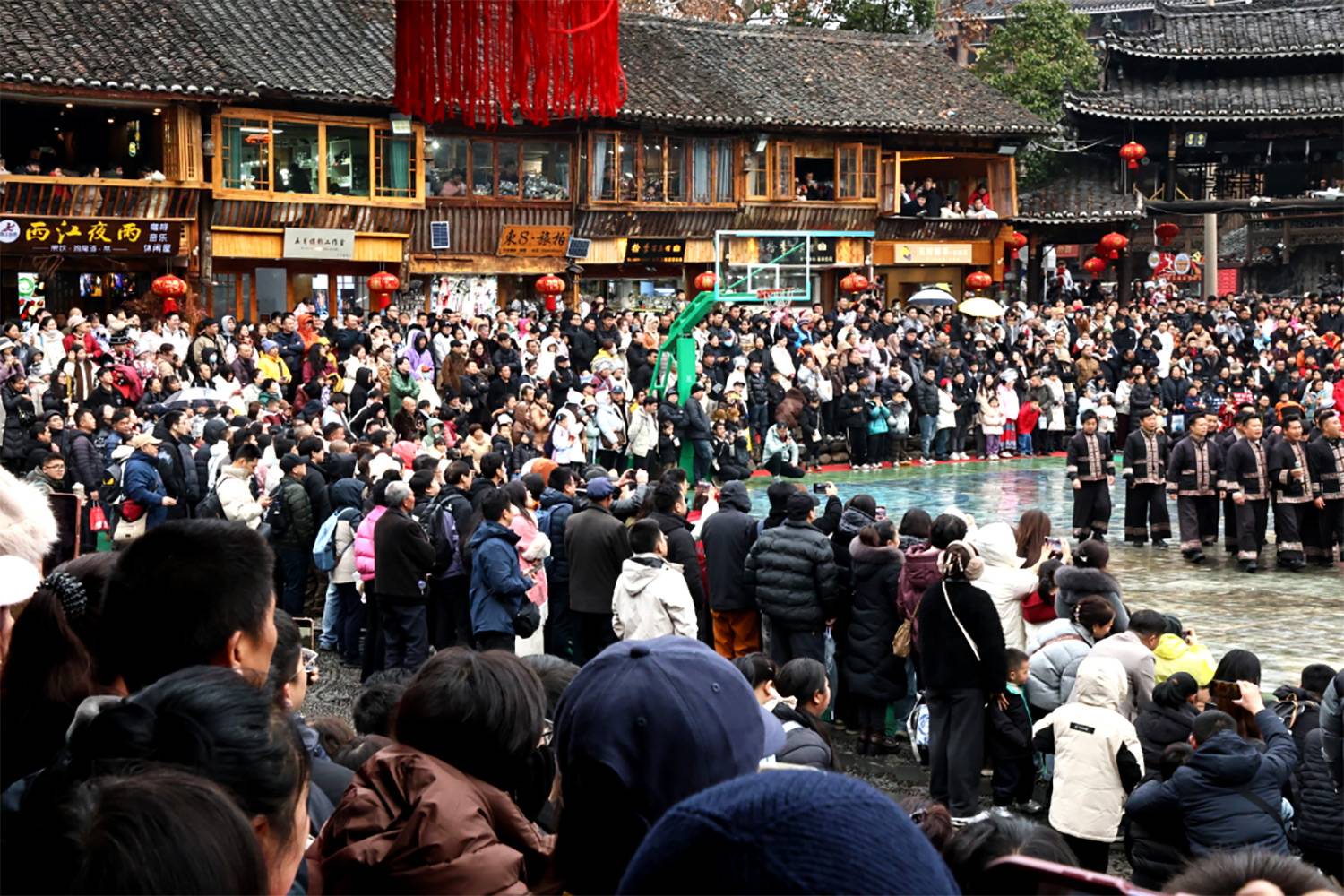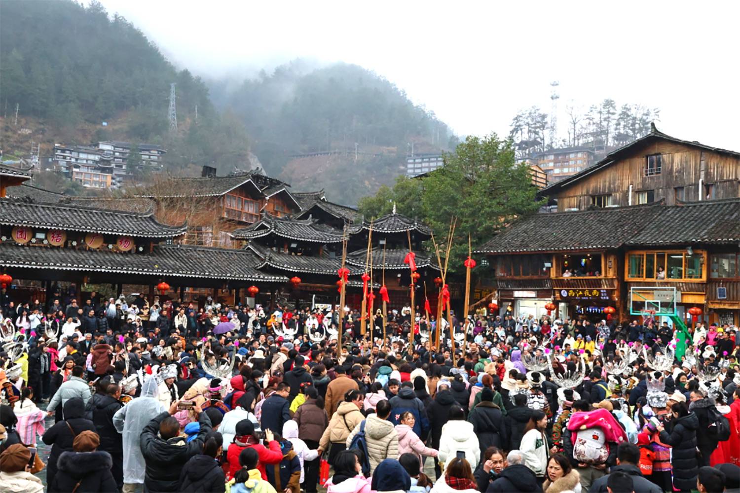 在这春节的喜庆氛围中,芦笙场的每一天都如同藏着盲盒般,充满了不期而遇的惊喜。游客们的欢声笑语此起彼伏,交织成一曲欢乐的乐章,他们尽情地沉浸其中,用心感受着深厚的春节传统风俗,享受着这充满年味的美好时光 。