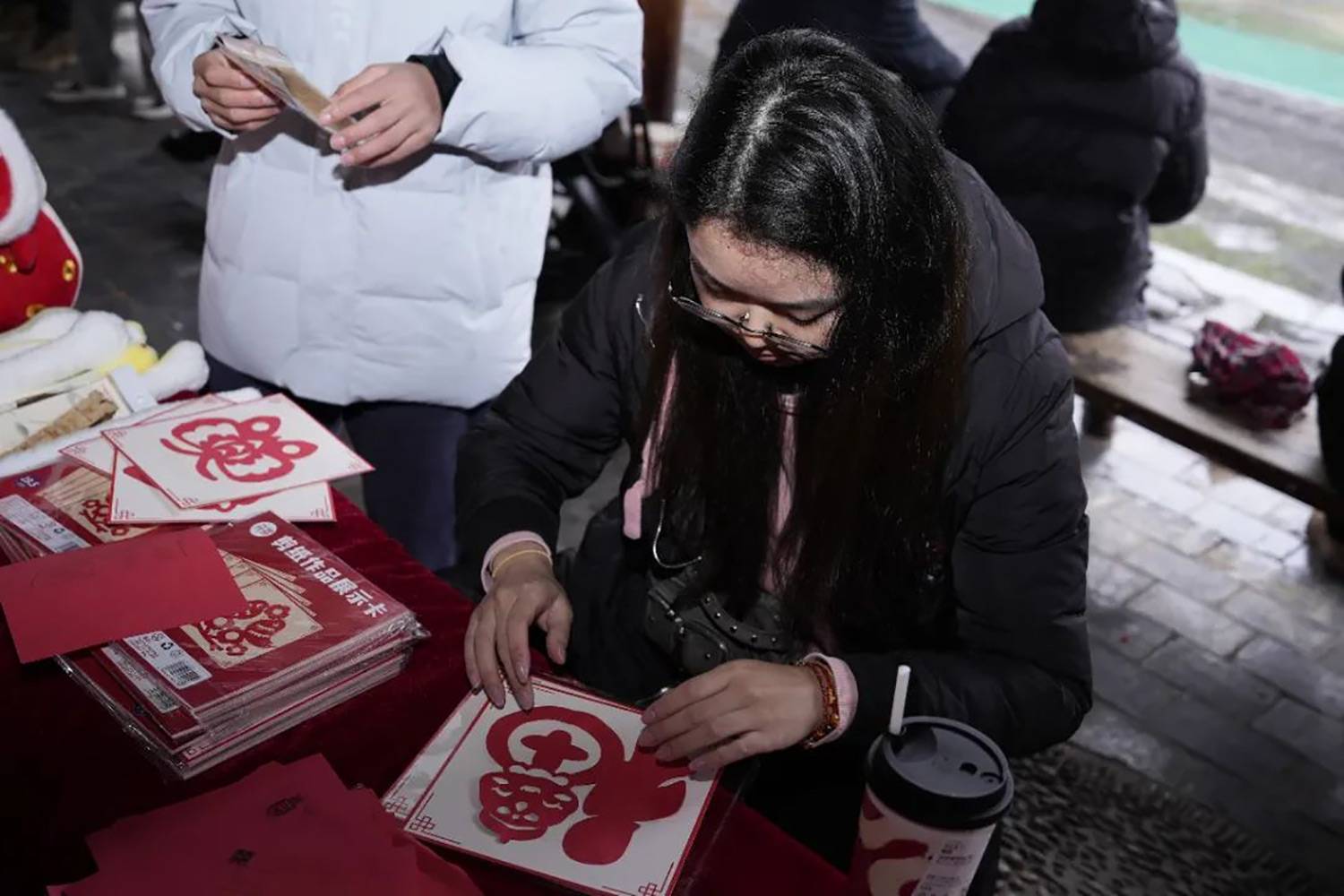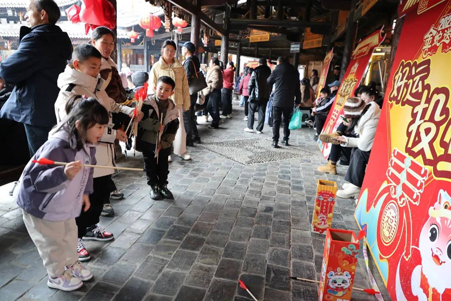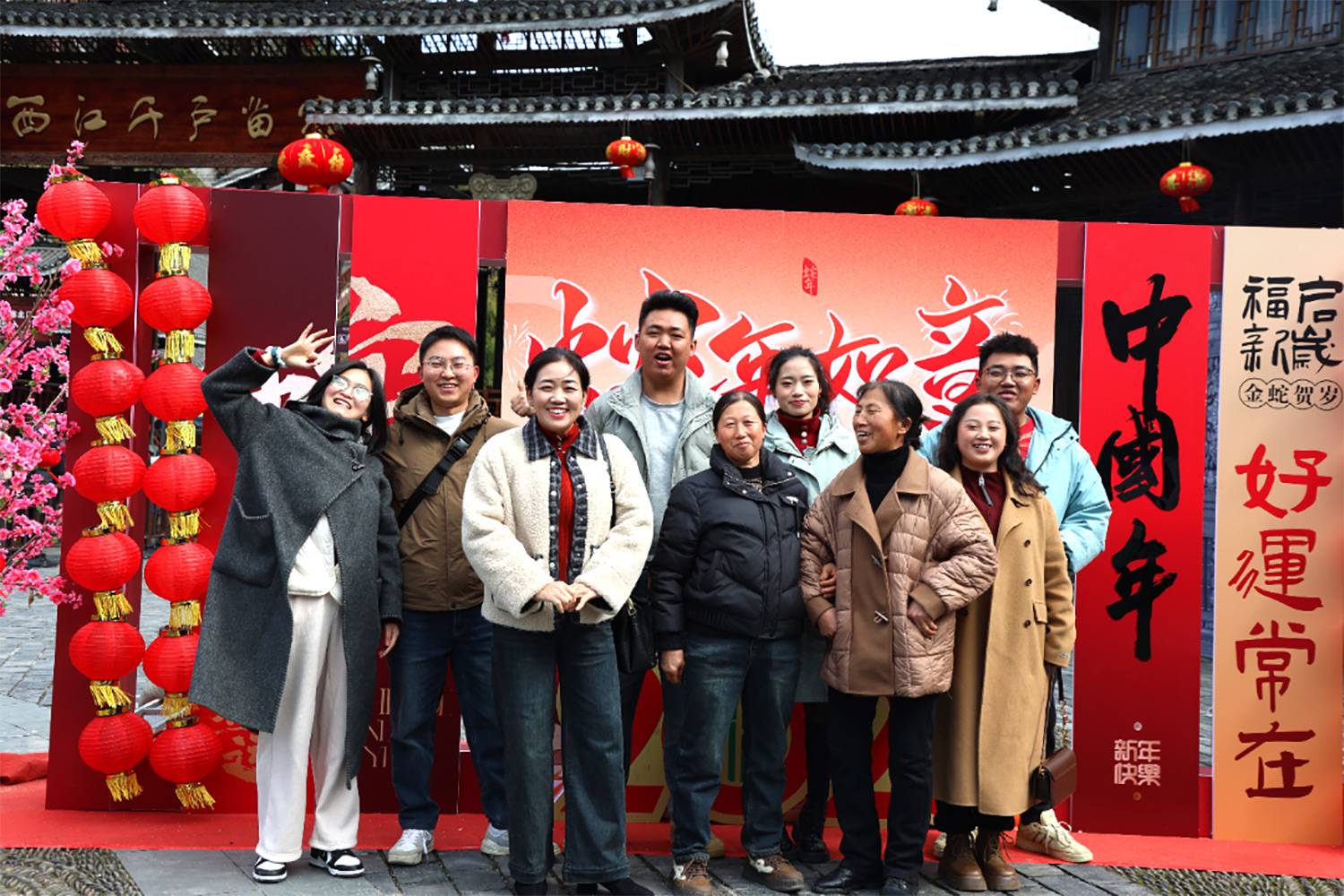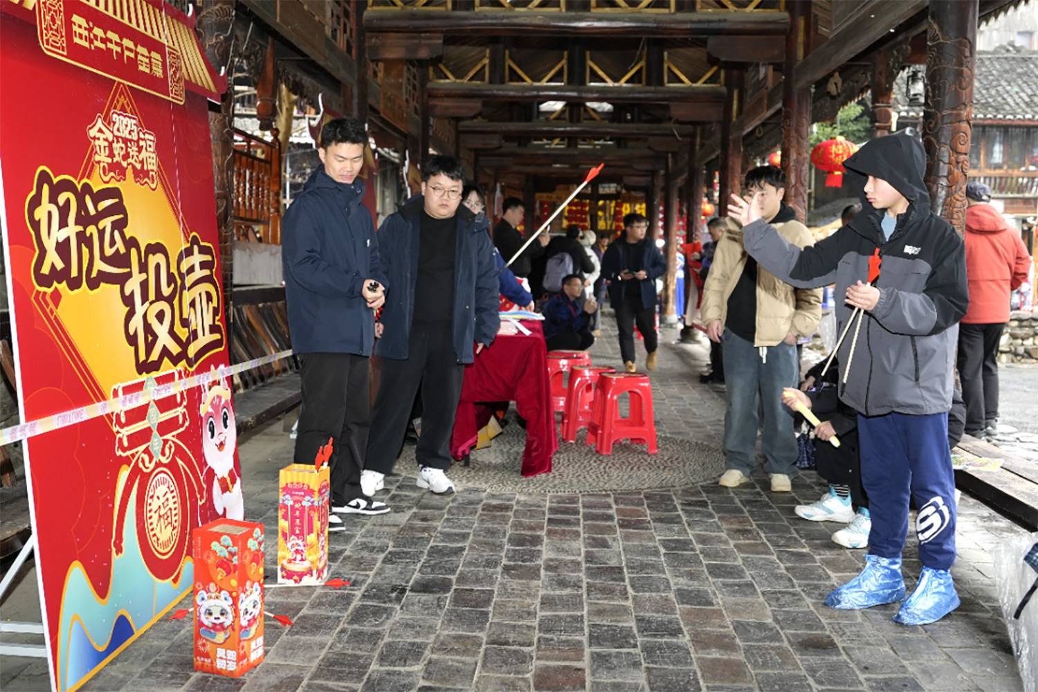 福蛇迎春,西江有好“市”!在芦笙场的长廊之上,一片热闹非凡的景象映入眼帘。游客们如潮水般涌来,纷纷围聚在各个活动区域,从年画拓印到好运投壶,每一天都充满新的惊奇和惊喜。