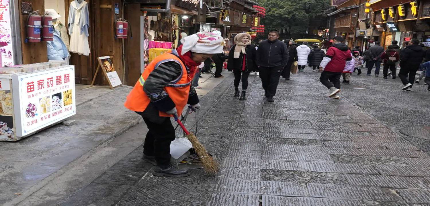 保洁人员不辞辛劳,如勤劳蜜蜂穿梭景区各处,不放过任何卫生死角。芦笙场、古街、游方街、人来人往的卫生间,都被打扫得一尘不染。西江千户苗寨在他们的努力下,始终以整洁清爽之姿迎接游客,让游客赏景之余倍感舒适惬意。
