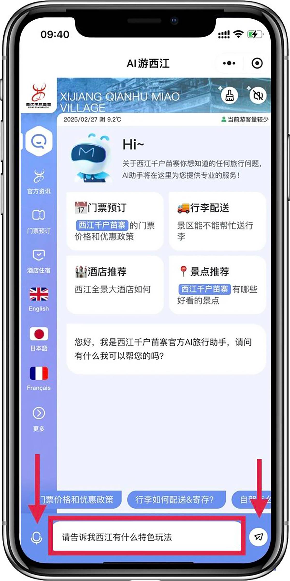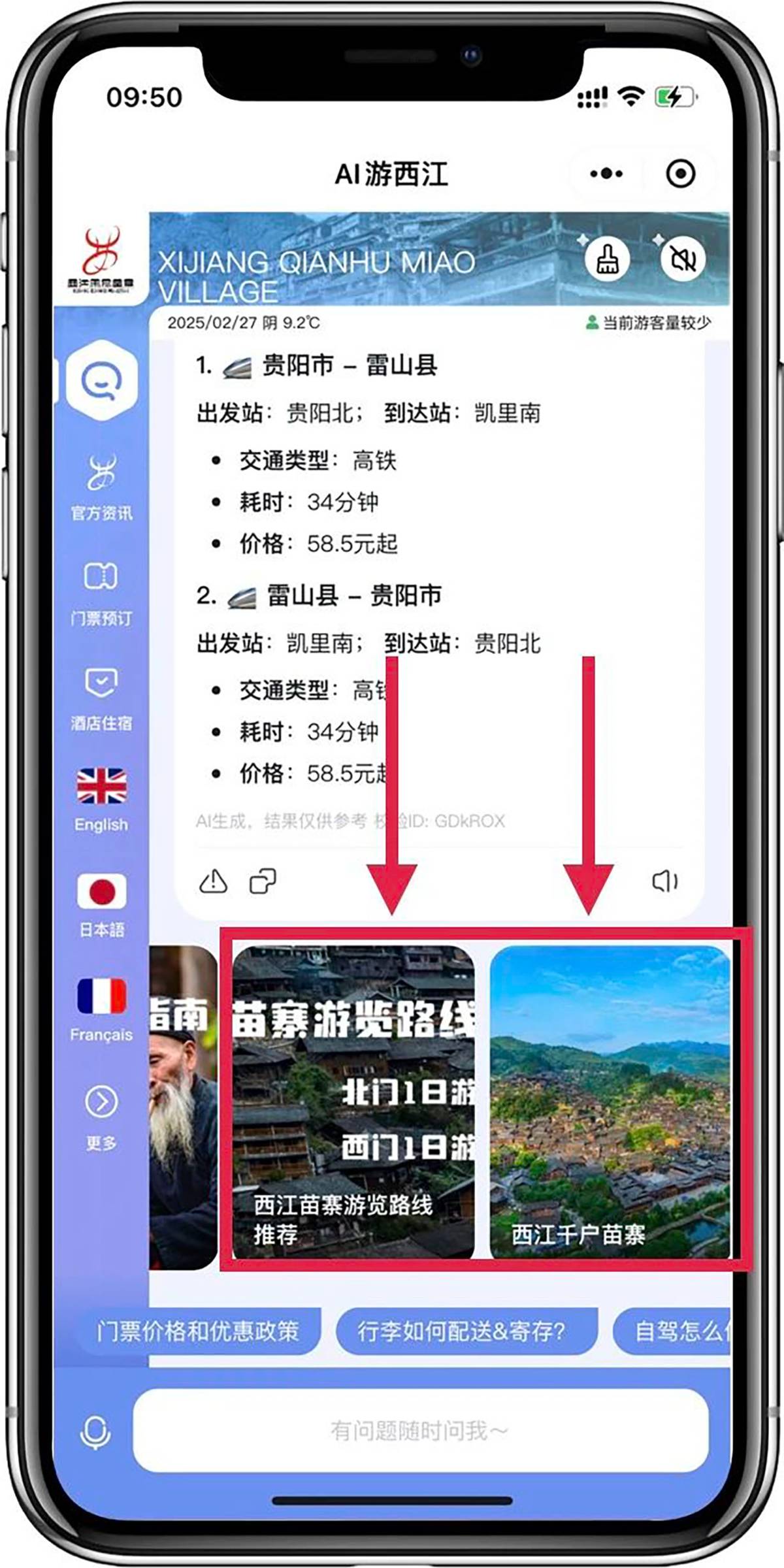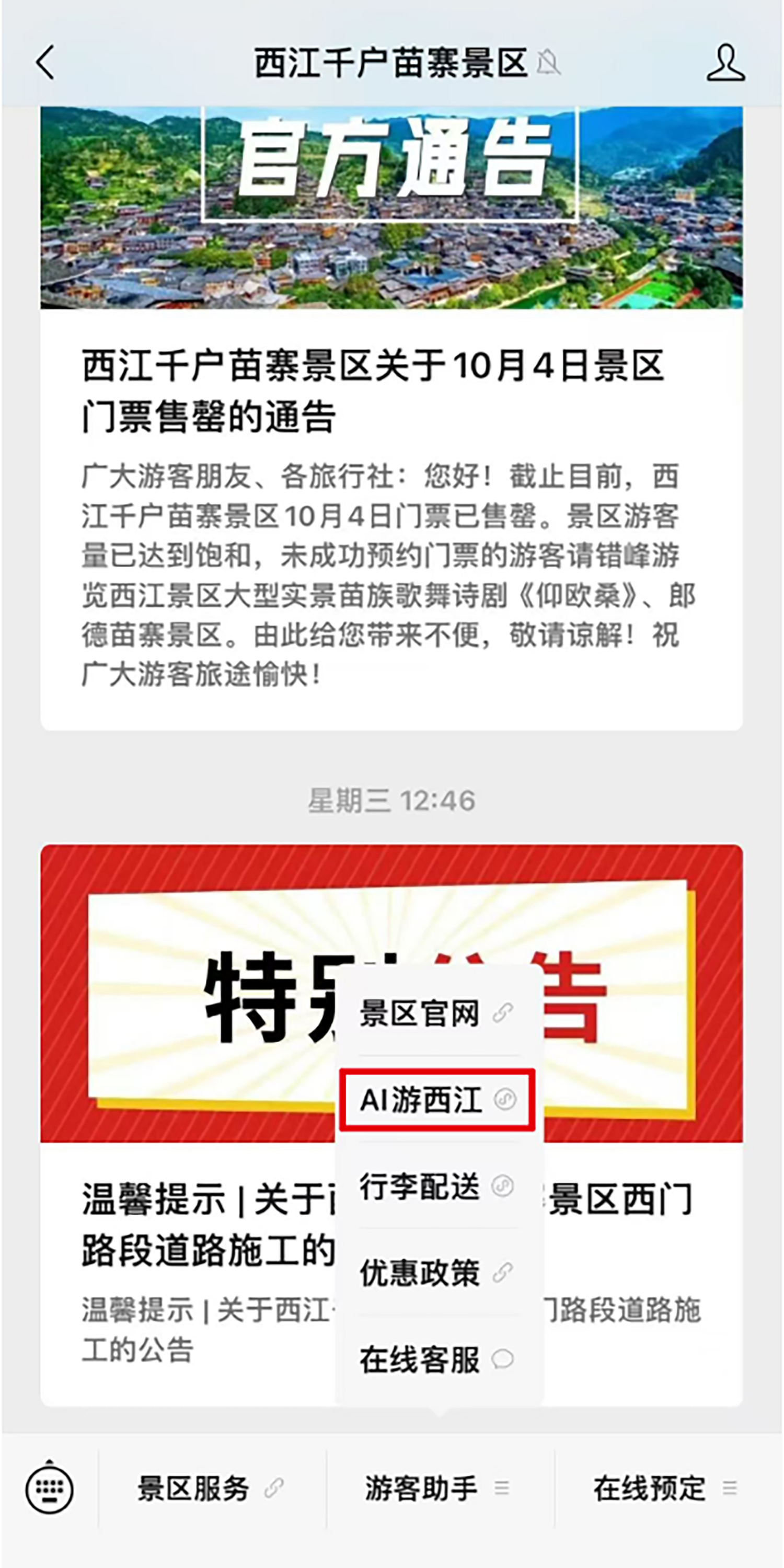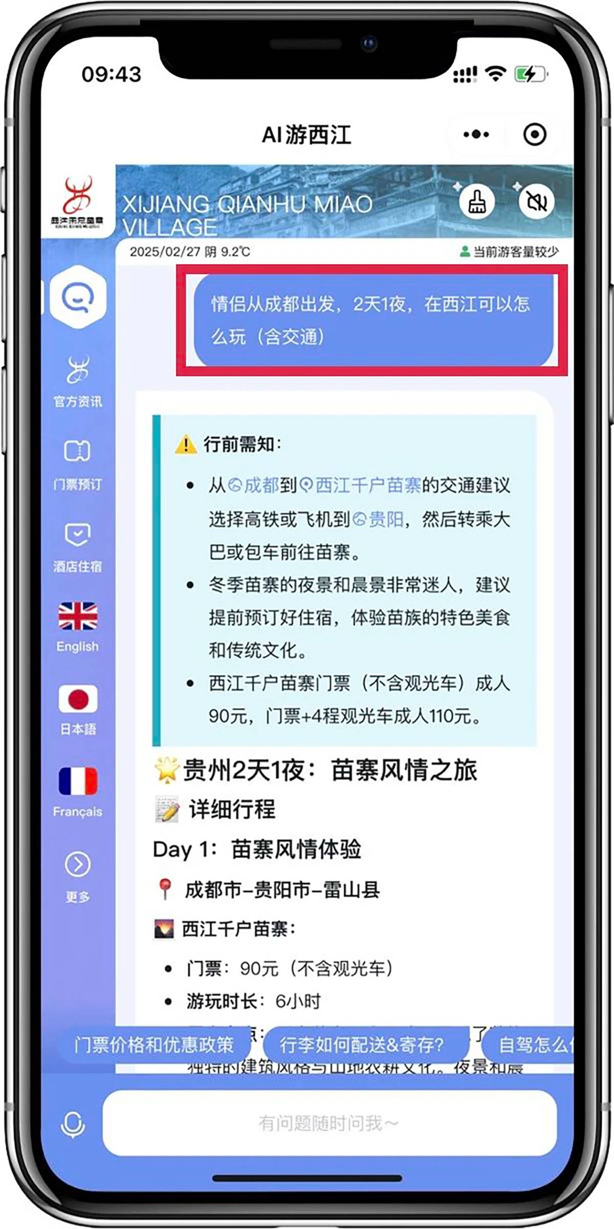 “AI游西江”不仅可根据提问快速梳理海量信息,提供基于个人偏好定制的推荐内容,还能实时获取西江千户苗寨官方资讯,确保信息及时准确性,帮助游客应对突发状况。