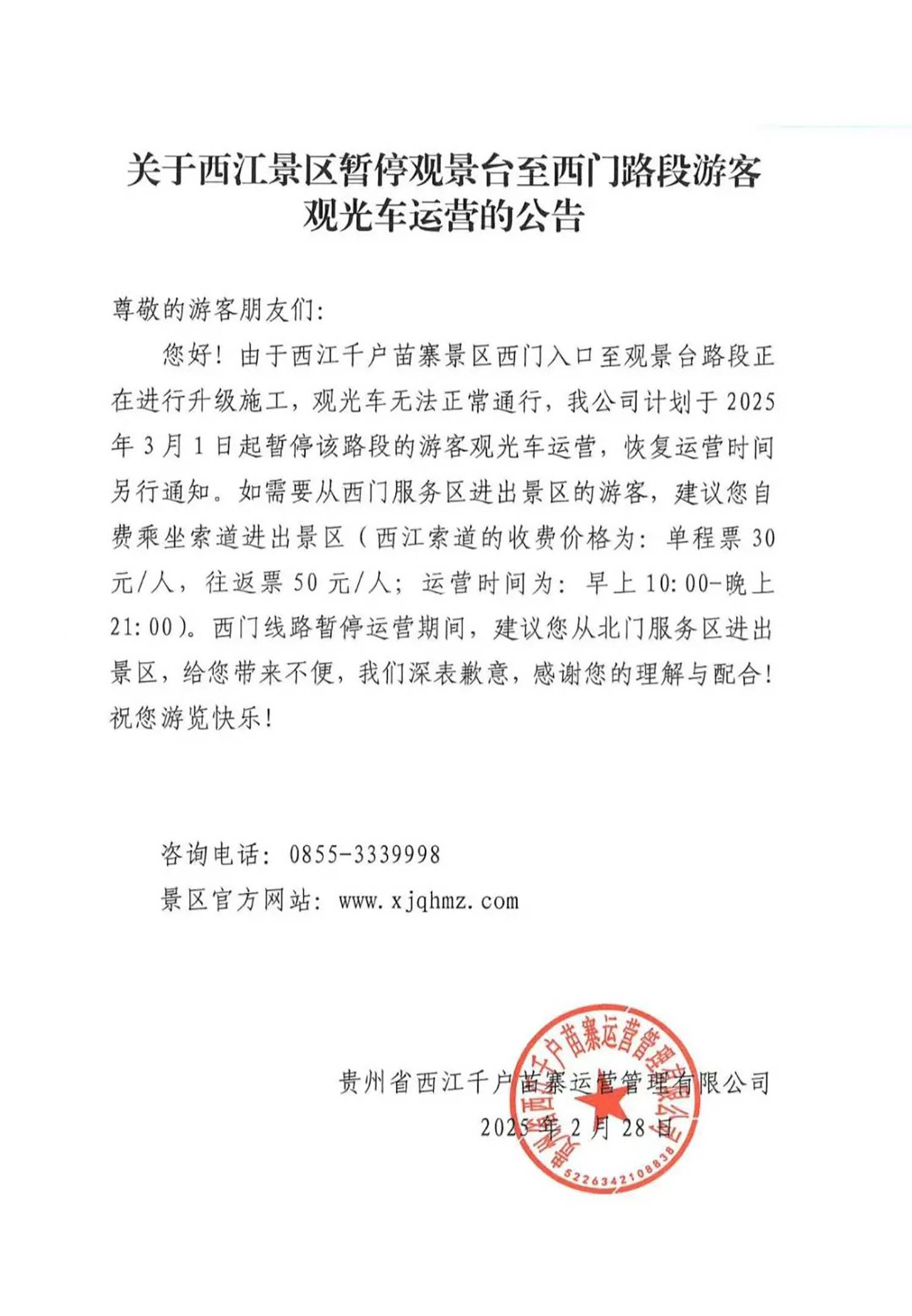 关于西江景区暂停观景台至西门路段游客观光车运营的公告