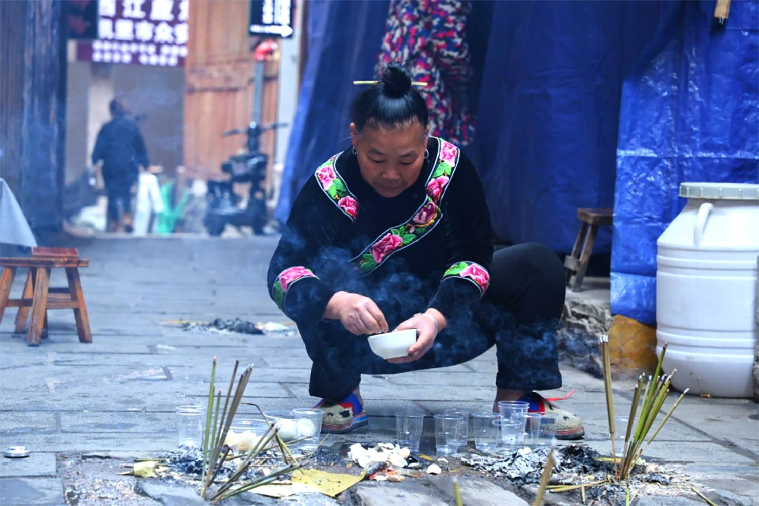 二月二这场春日庆典,西江苗寨的村民称“祭桥”之日,也称“敬桥节”。这一天村民自带煮熟的红鸡蛋、米酒腊肉、糯米饭等祭品,携家人来到家族桥头敬桥,焚香祷告,祈愿新的一年家宅平安,五谷丰登,风调雨顺。