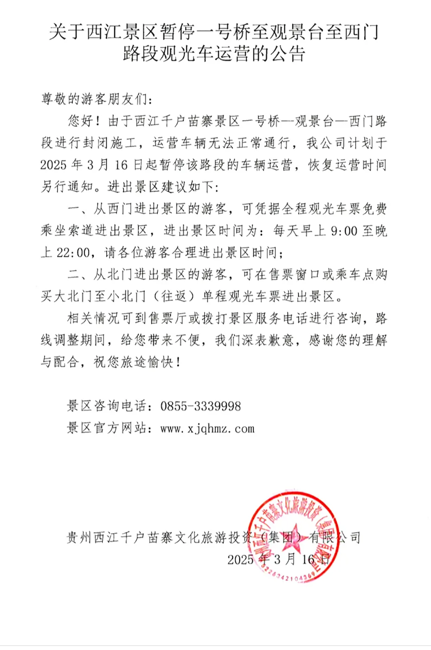 关于西江景区暂停一号桥至观景台至西门路段观光车运营的公告