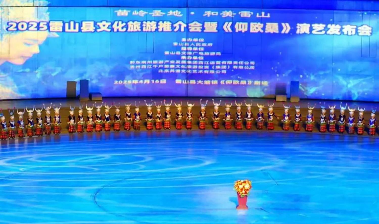 4月16日,“苗岭圣地・和美雷山——2025雷山县文化旅游推介会暨《仰欧桑》演艺发布会” 在雷山县大塘镇《仰欧桑》剧场盛大举行。省内外各大旅行社、媒体界同仁、各界嘉宾及上千游客齐聚一堂共睹升级版“大型实景苗族歌舞诗剧《仰欧桑》”震撼开演。