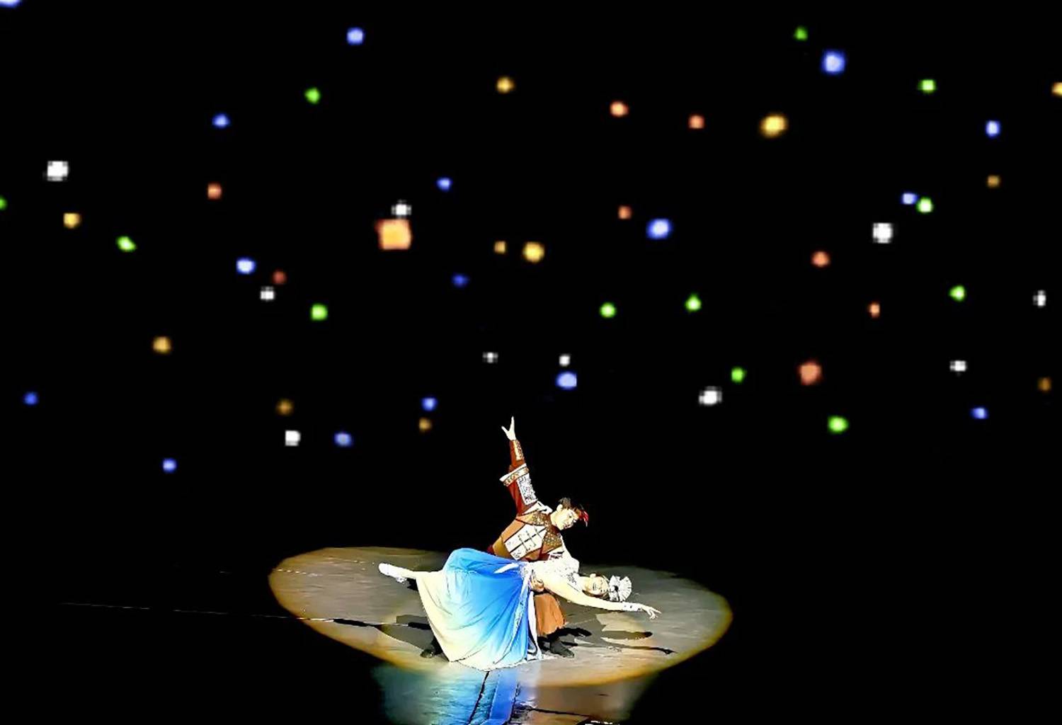 《远方的思念》重新编排演员舞台调度,利用移动景片的窗口,通过太阳在窗口的表演,形成与仰欧桑在不同时空的并置,展现太阳和仰欧桑彼此的思念。同时,重新编排锦鸡群舞,演员从前区出场形成通道式的队形,寓意照亮太阳远行的路,体现仰欧桑的心境。这种创新的舞台调度和舞蹈编排,使场景更加富有诗意和情感张力。