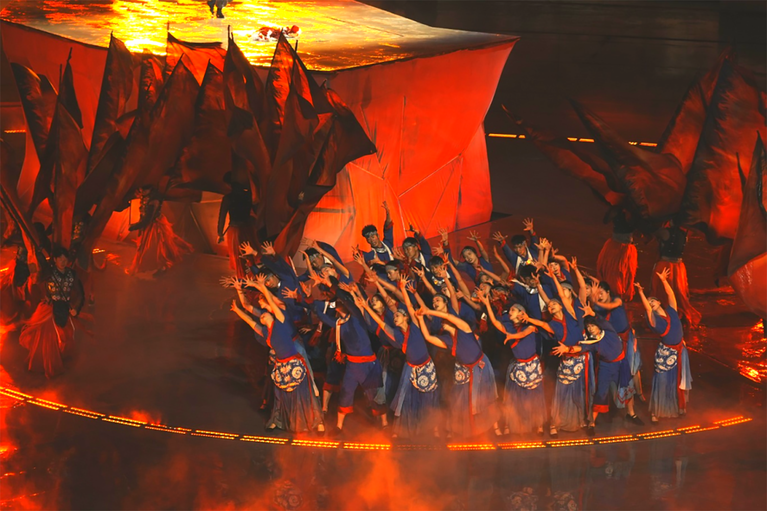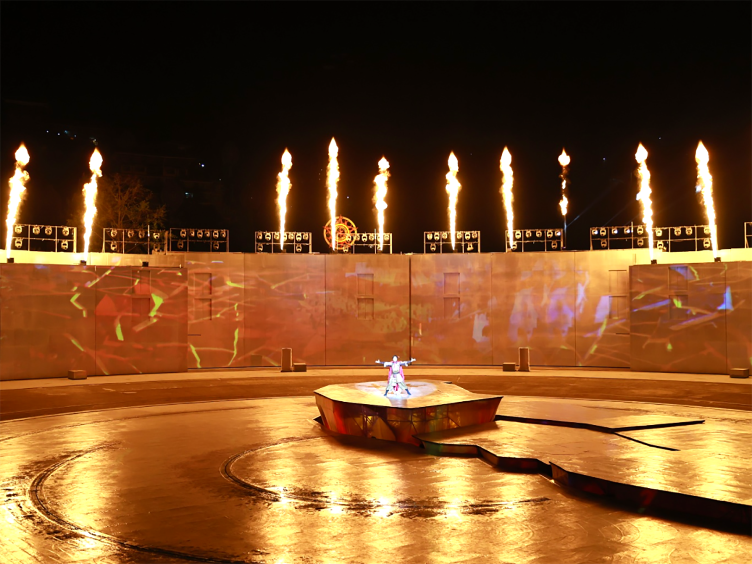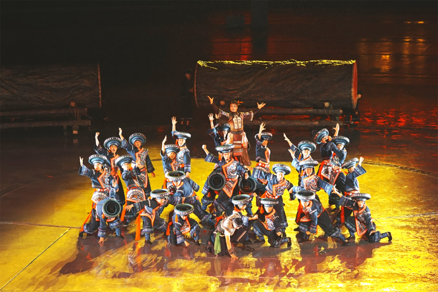 在第二场《木鼓唤太阳》中,铜鼓处地面增加电脑切割灯,渲染太阳出场背景效果,突出太阳主角地位。