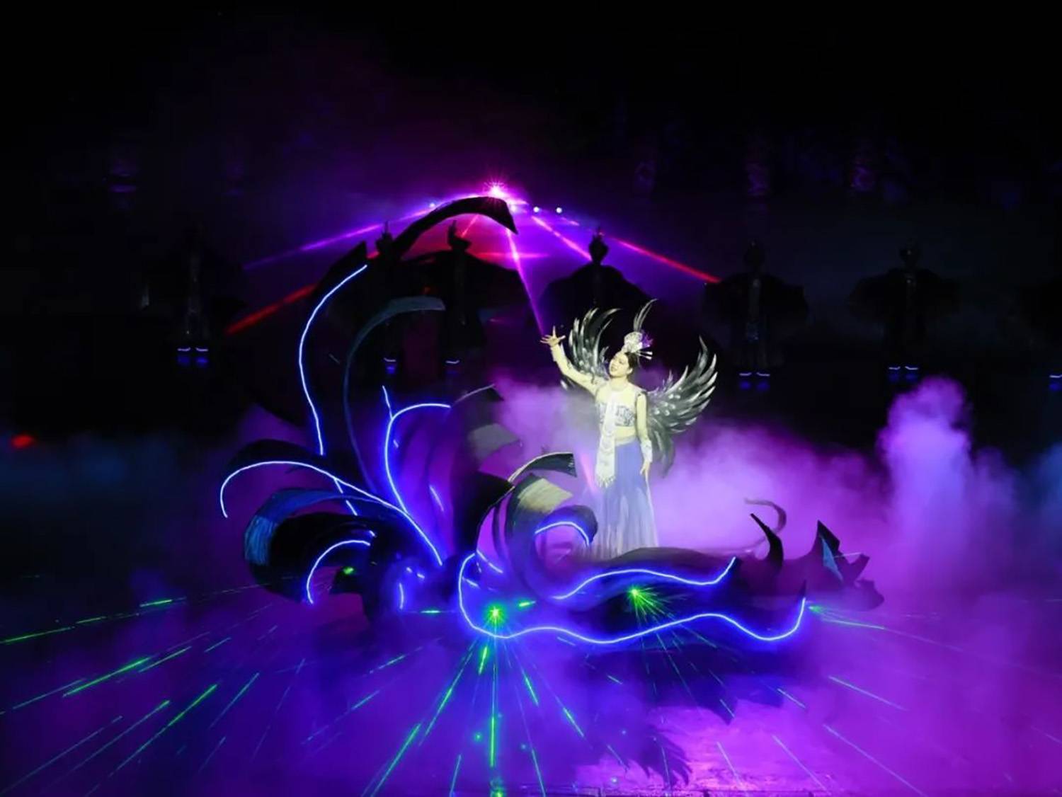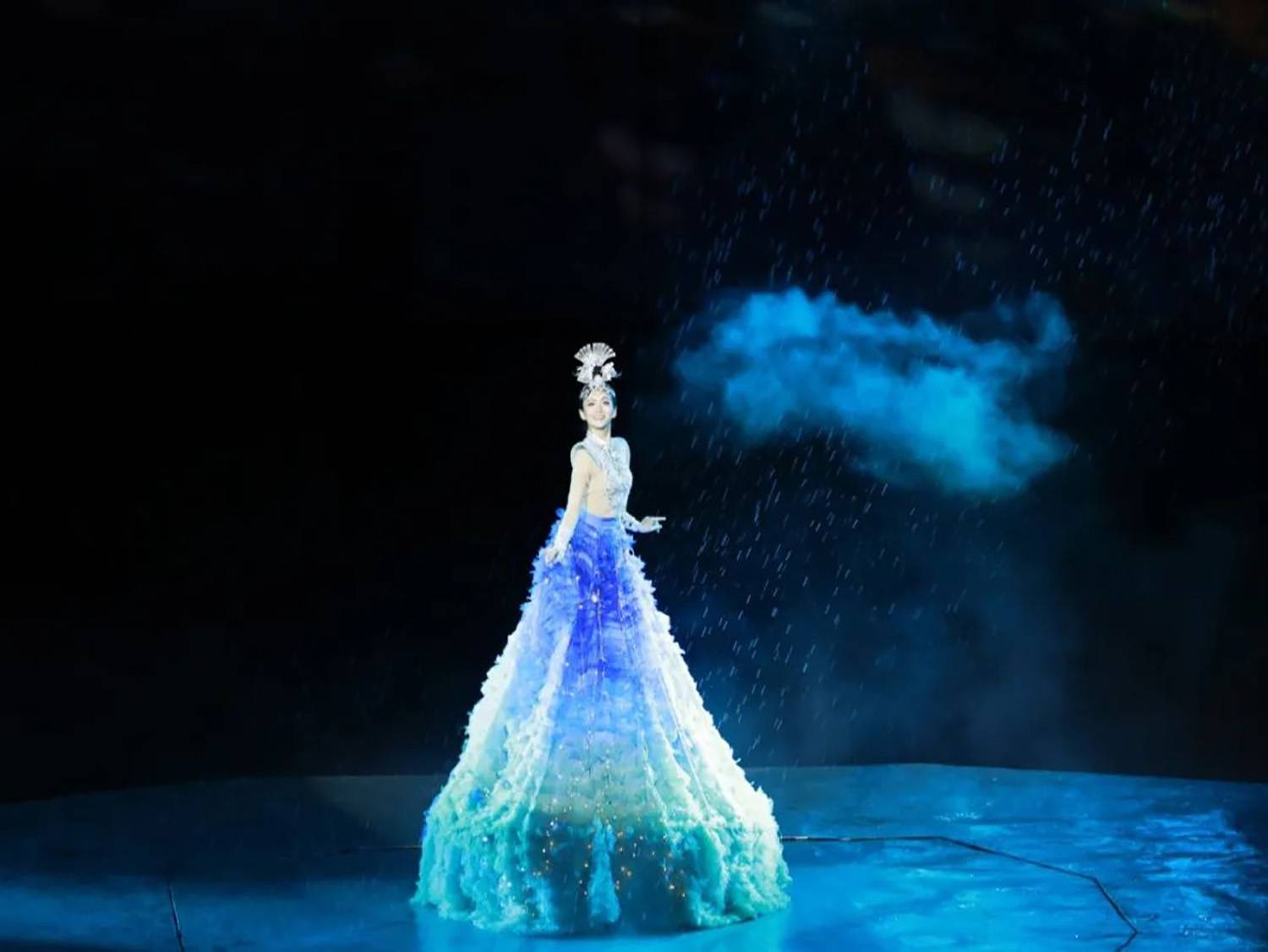在序《水孕仰欧桑》中,对女主角仰欧桑的裙子进行精心改造。通过在裙摆编织LED灯带并覆盖薄纱,使仰欧桑在出场时更加光彩夺目,营造如梦如幻的神秘氛围,仿佛她从水中缓缓诞生,带着自然的灵气与诗意,吸引观众的目光,增强角色舞台表现力和故事代入感。
