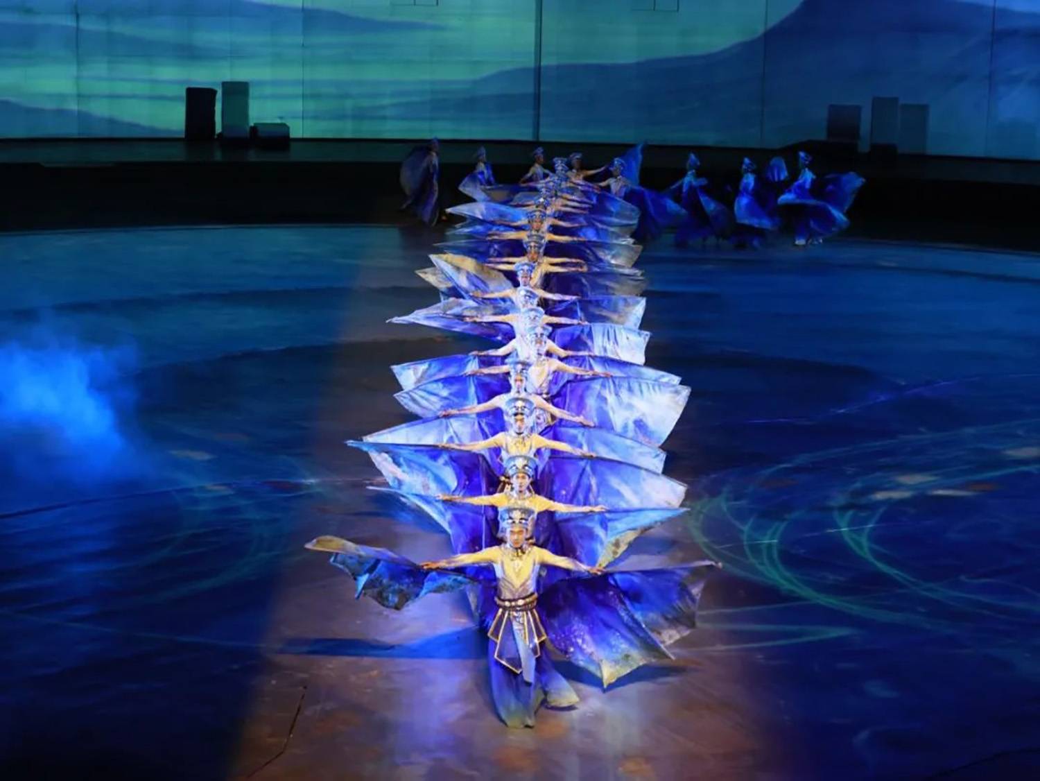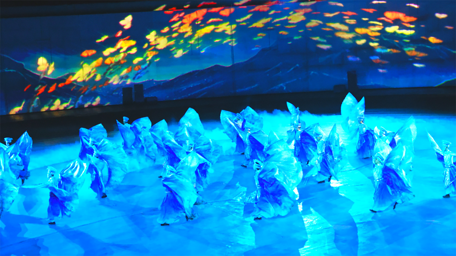 序《水孕仰欧桑》中重新制作投影内容,根据舞蹈队形进行变换。画面由四面水或水型蝴蝶汇聚变大水滴,将动态的画面效果与舞蹈演员的动作相互配合,营造出水与生命交融的奇幻情景。伴随仰欧桑出现,景片上的“远山”画面虚化,地面画面营造水波纹视觉呈现,波纹散开后再出现山水画面,景片和地面素材内容上下视觉统一风格。精心设计的多媒体视觉呈现,为观众带来一场视觉盛宴,使观众能够更好地理解和感受剧情的发展……