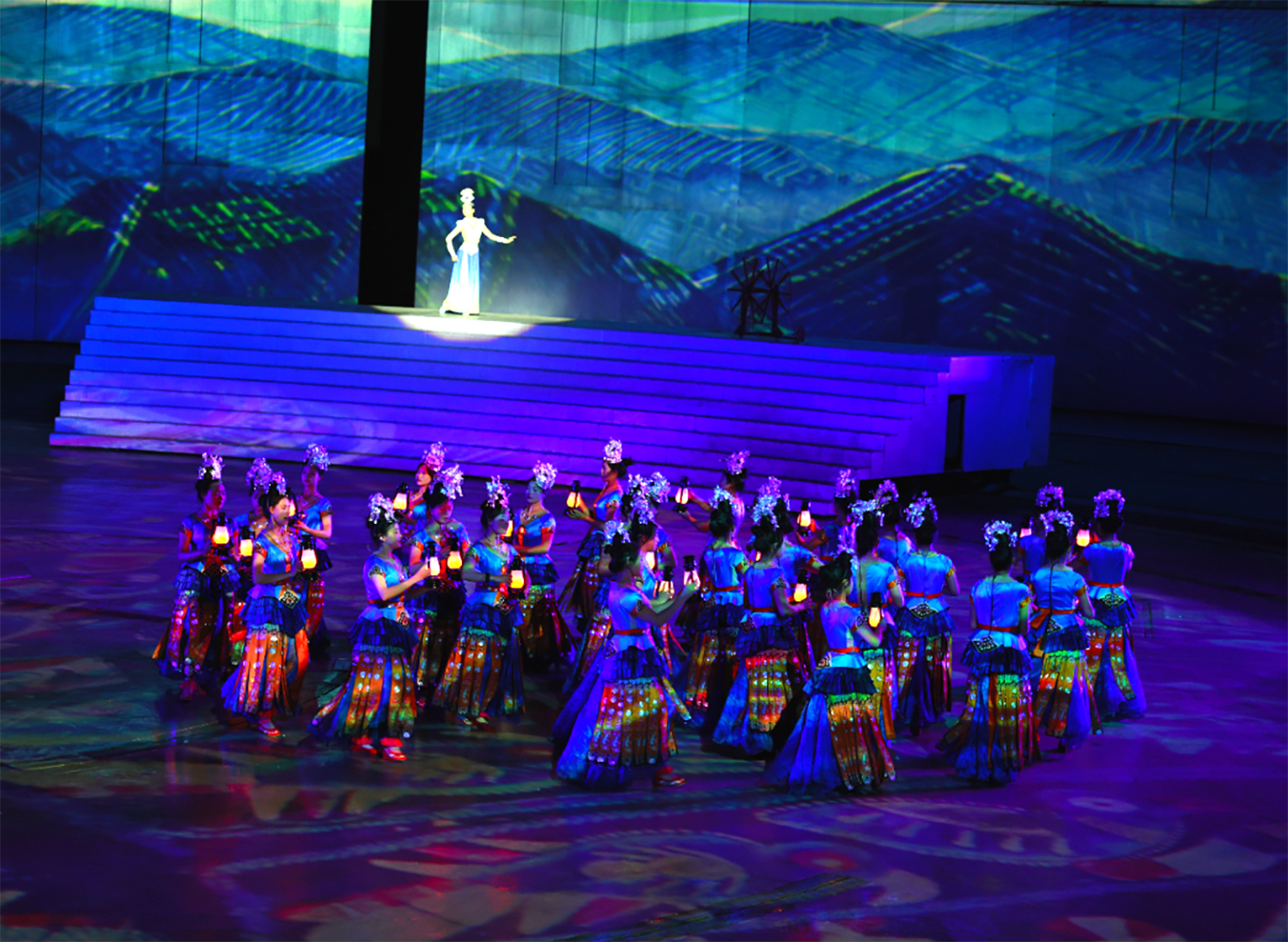 在第七场《远方的思念》中,增加30个手持马灯道具,丰富了舞台画面,演员手持马灯进行表演,不仅营造出了温馨而浪漫的氛围,还强化“思念”效果。同时对太阳景片进行扩大化处理,增加外延部分,强化太阳元素视觉呈现。