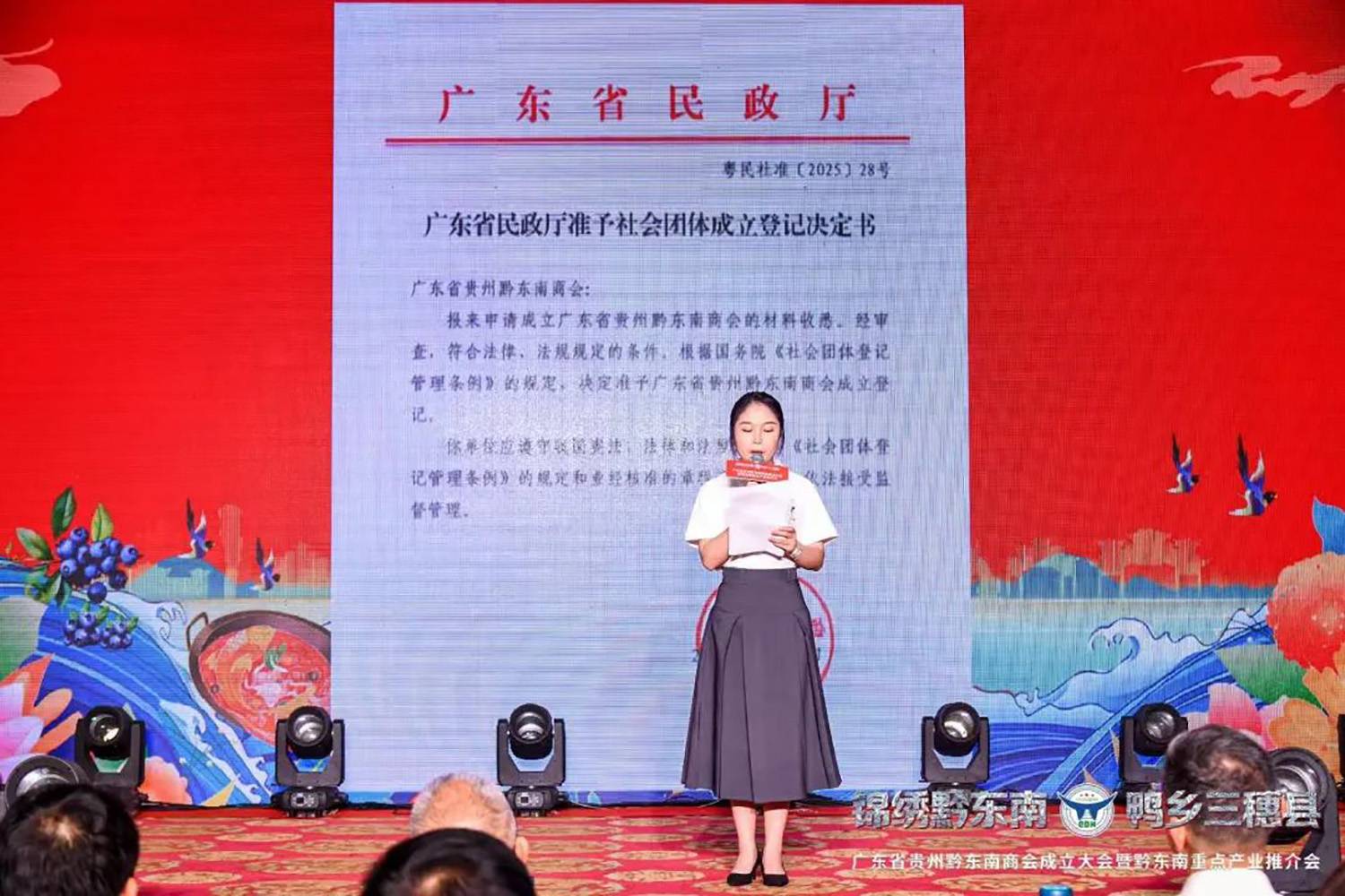 主持人宣读《广东省民政厅准予社会团体成立登记决定书》
