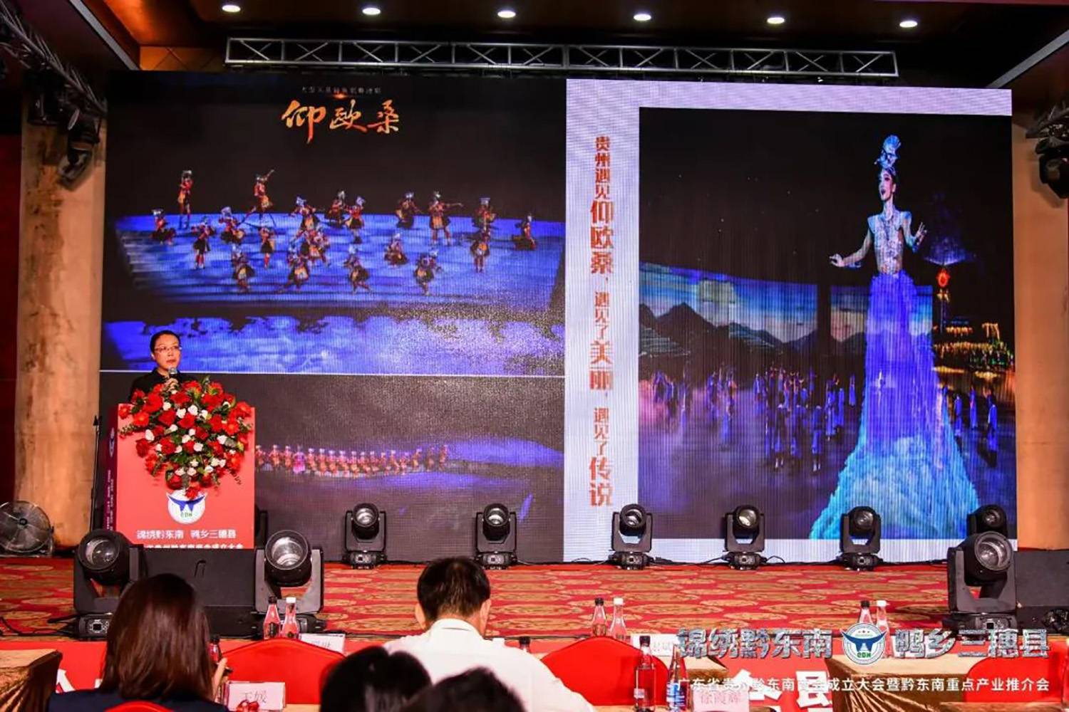 在热烈的氛围中,会议就章程和各项提案进行审议和表决。在重点产业推介环节,黔东南州商务局、文体广电旅游局,以及各县政府和公司,围绕农业、文化旅游等领域作推介。其中,贵州西江千户苗寨文化旅游投资(集团)有限公司就“西江千户苗寨景区”、“郎德苗寨”和《仰欧桑》文旅项目进行宣传推介。