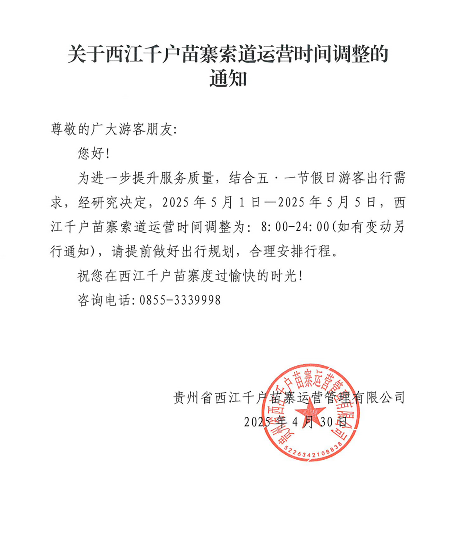 为进一步提升服务质量,结合五·一节假日游客出行需求,经研究决定,2025年5月1日-2025年5月5日,西江千户苗寨索道运营时间调整为:8:00-24:00(如有变动另行通知),请提前做好出行规划,合理安排行程。