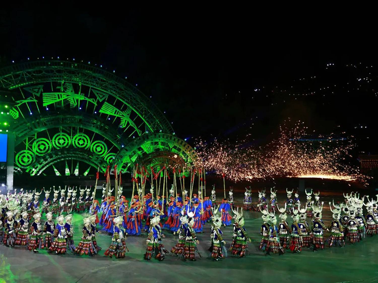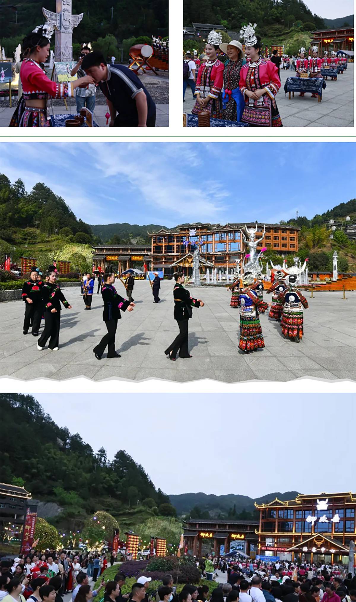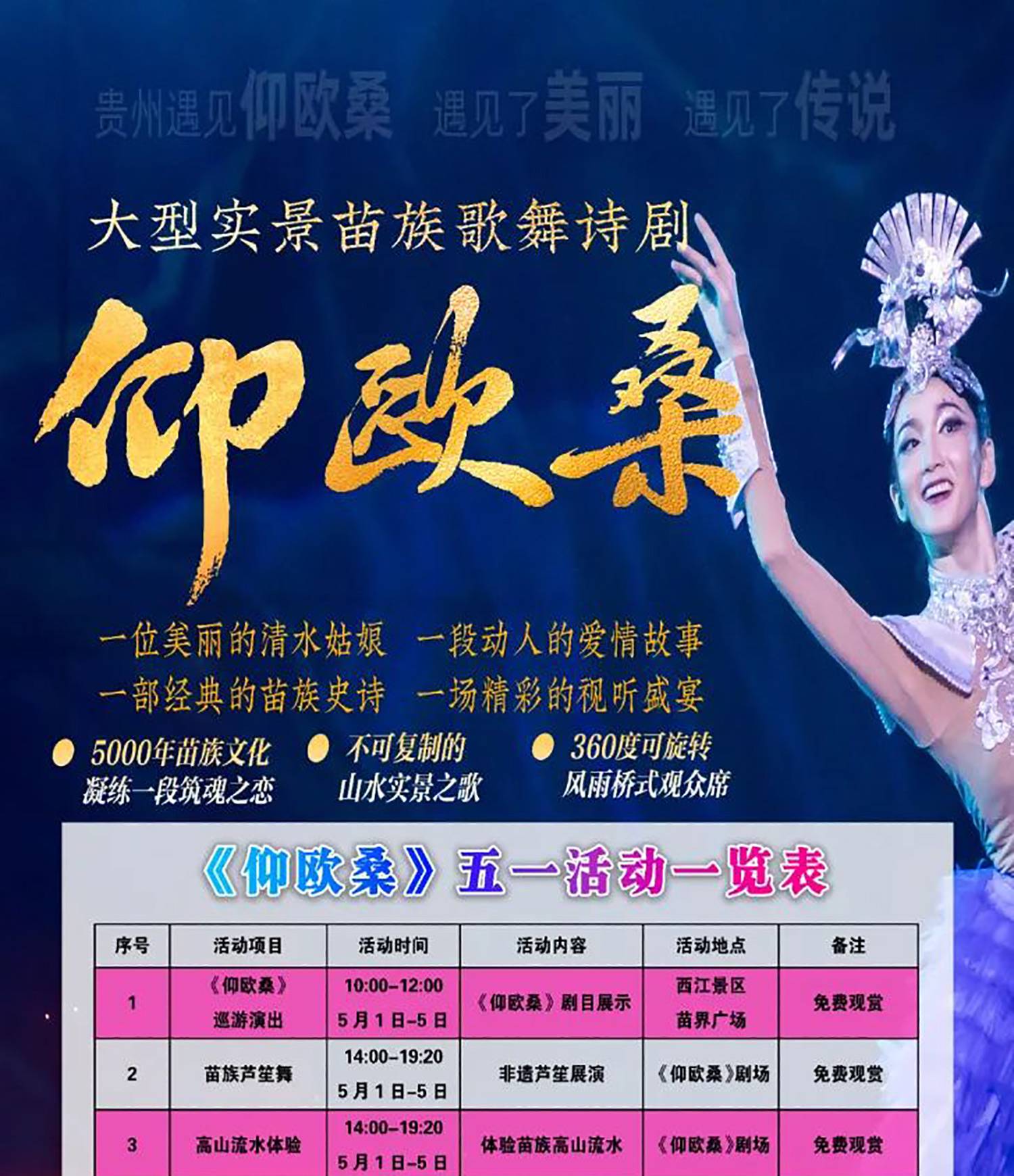 而整个活动的重头戏 ——《仰欧桑》剧目表演,更是不容错过!五一期间,每晚 19:30 - 20:30、21:00 - 22:00,这部大型实景苗族歌舞诗剧都会在剧场准时开演。以清水姑娘仰欧桑的动人爱情故事为主线,凝练 5000 年苗族文化精髓,在 360 度可旋转的风雨桥式观众席环绕下,打造出一场不可复制的山水实景视听盛宴。