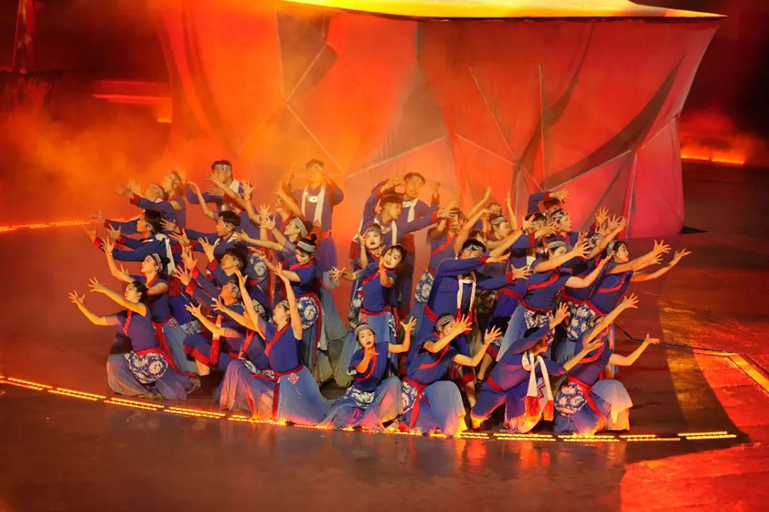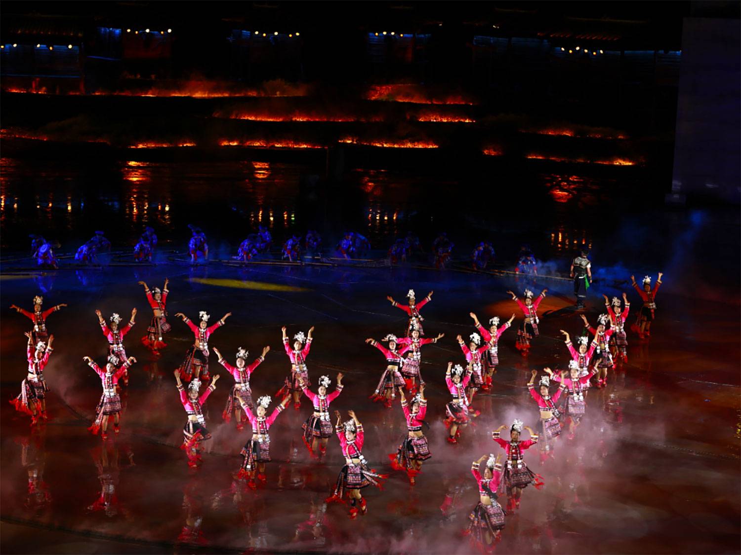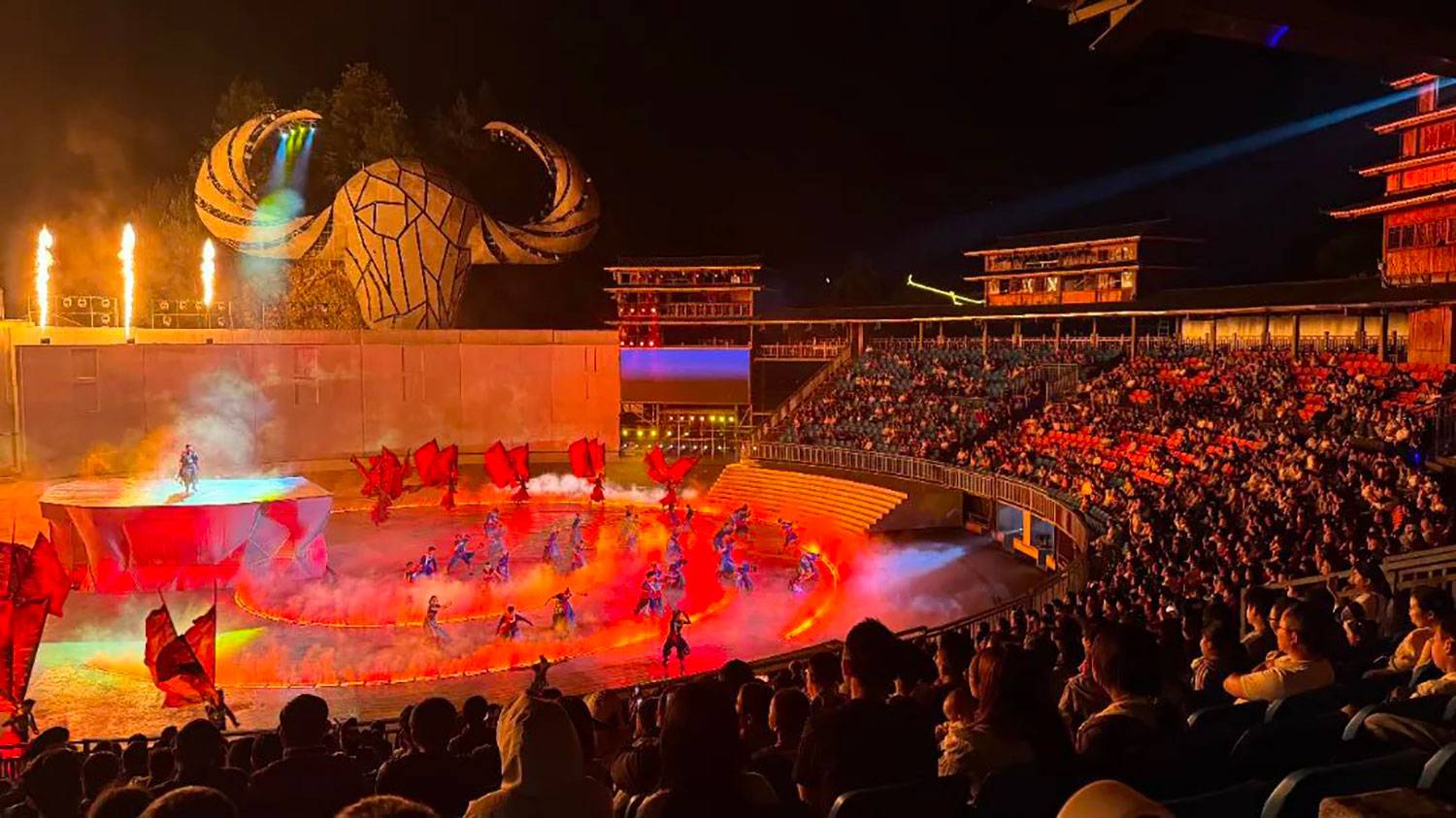 而整个活动的重头戏 ——《仰欧桑》剧目表演,更是不容错过!五一期间,每晚 19:30 - 20:30、21:00 - 22:00,这部大型实景苗族歌舞诗剧都会在剧场准时开演。以清水姑娘仰欧桑的动人爱情故事为主线,凝练 5000 年苗族文化精髓,在 360 度可旋转的风雨桥式观众席环绕下,打造出一场不可复制的山水实景视听盛宴。