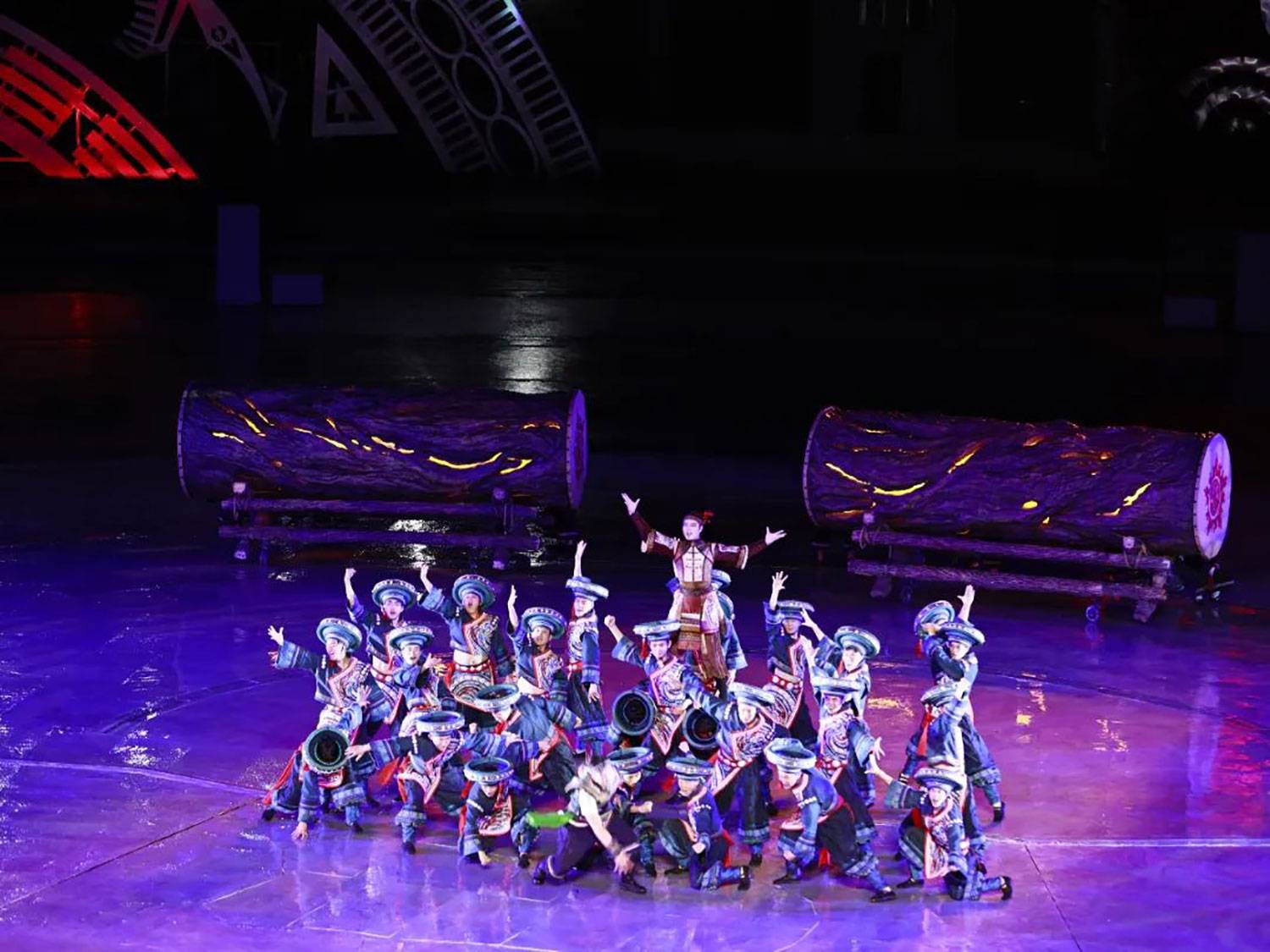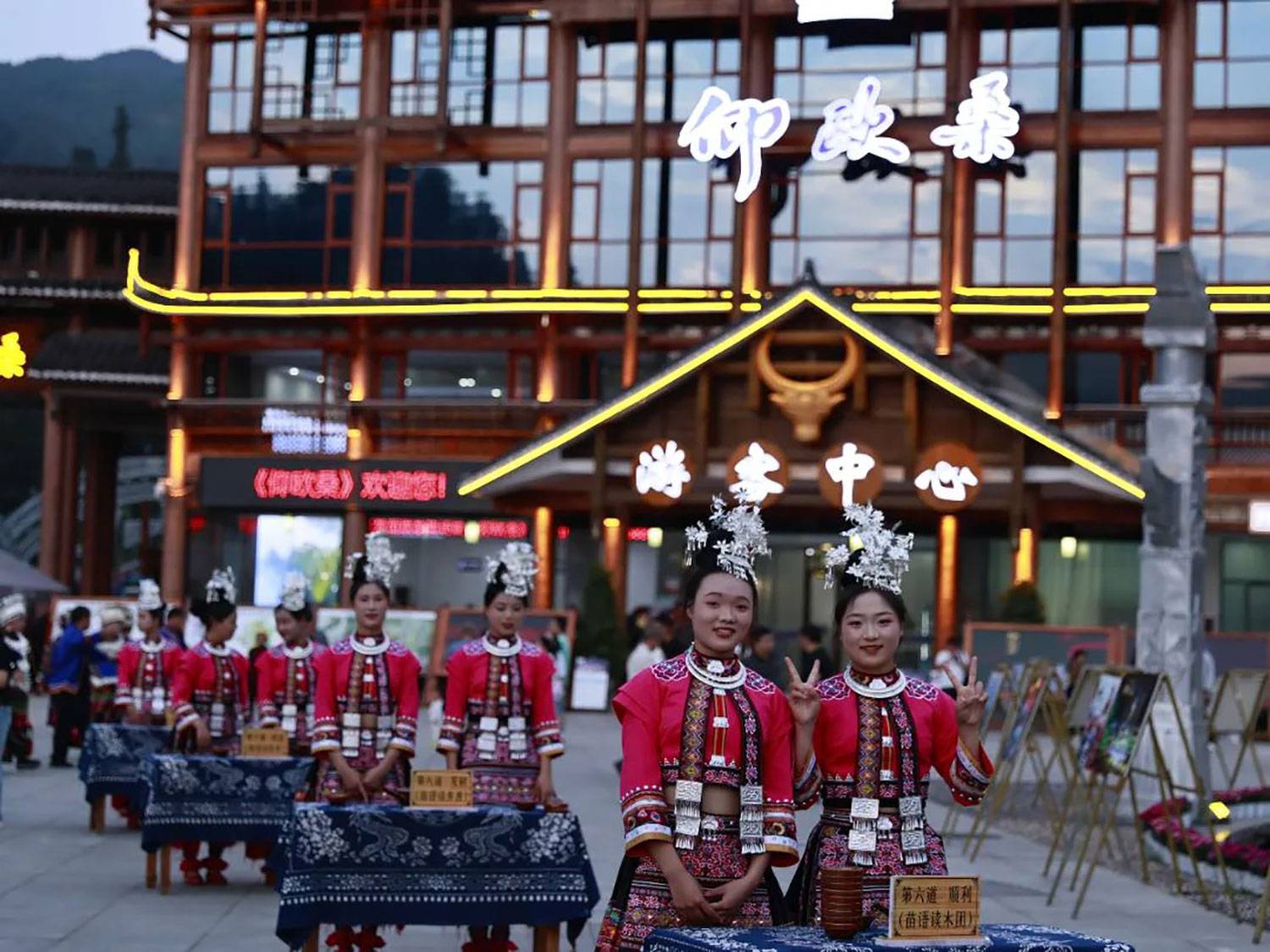 下午,《仰欧桑》剧场外便热闹非凡。苗族芦笙舞展演率先登场,悠扬的芦笙声与灵动的舞姿,完美诠释着非遗文化的独特魅力;高山流水体验更是趣味十足,游客们在热情的氛围中,感受着苗族独特的饮酒文化;掌坳铜鼓舞、短裙苗族文化歌舞展演也轮番上阵,苗族传统舞蹈的风采尽显无遗。