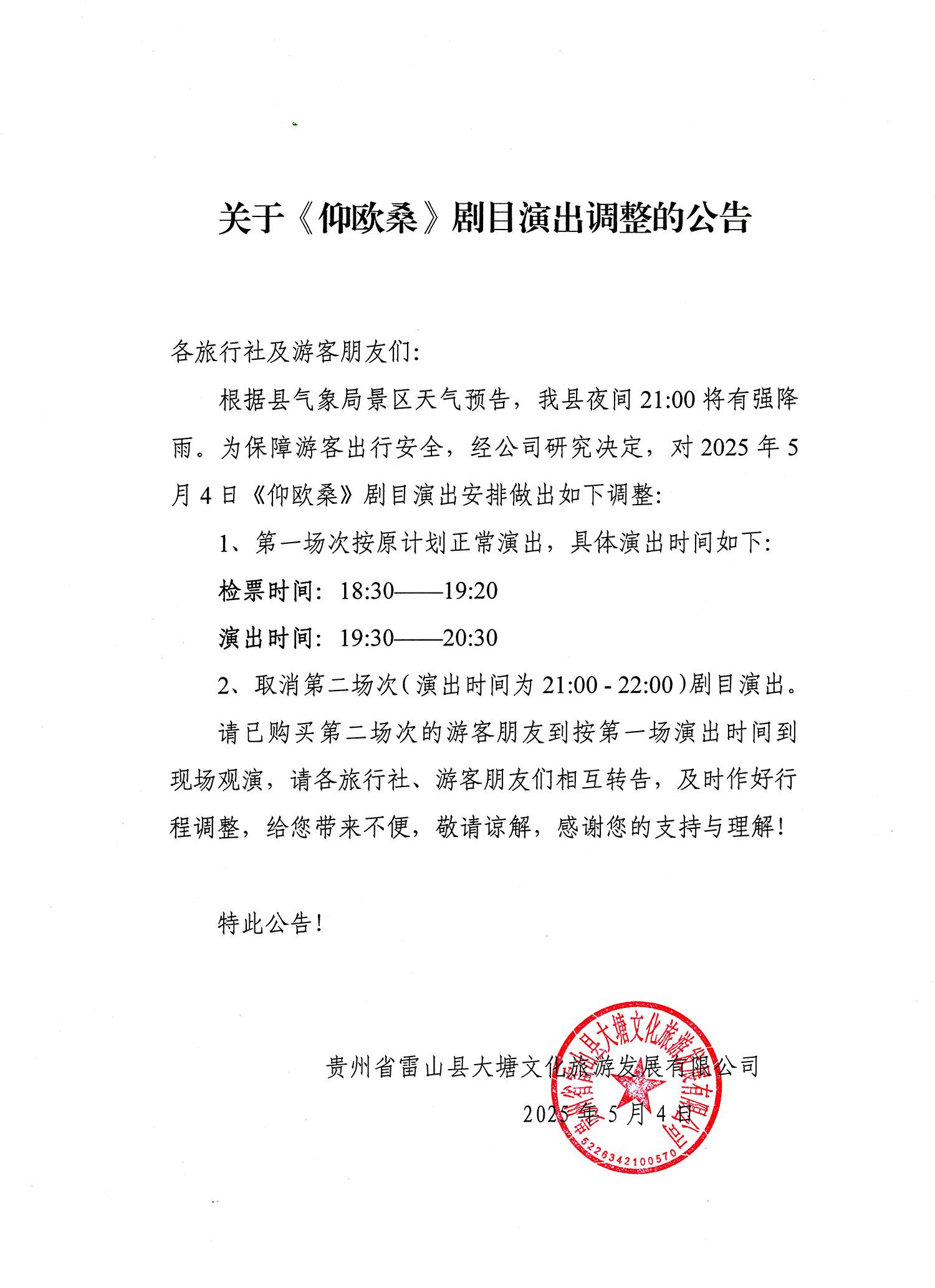 根据县气象局景区天气预告,我县夜间21:00将有强降雨。为保障游客出行安全,经公司研究决定,对2025年5月4日《仰欧桑》剧目演出安排做出如下调整: