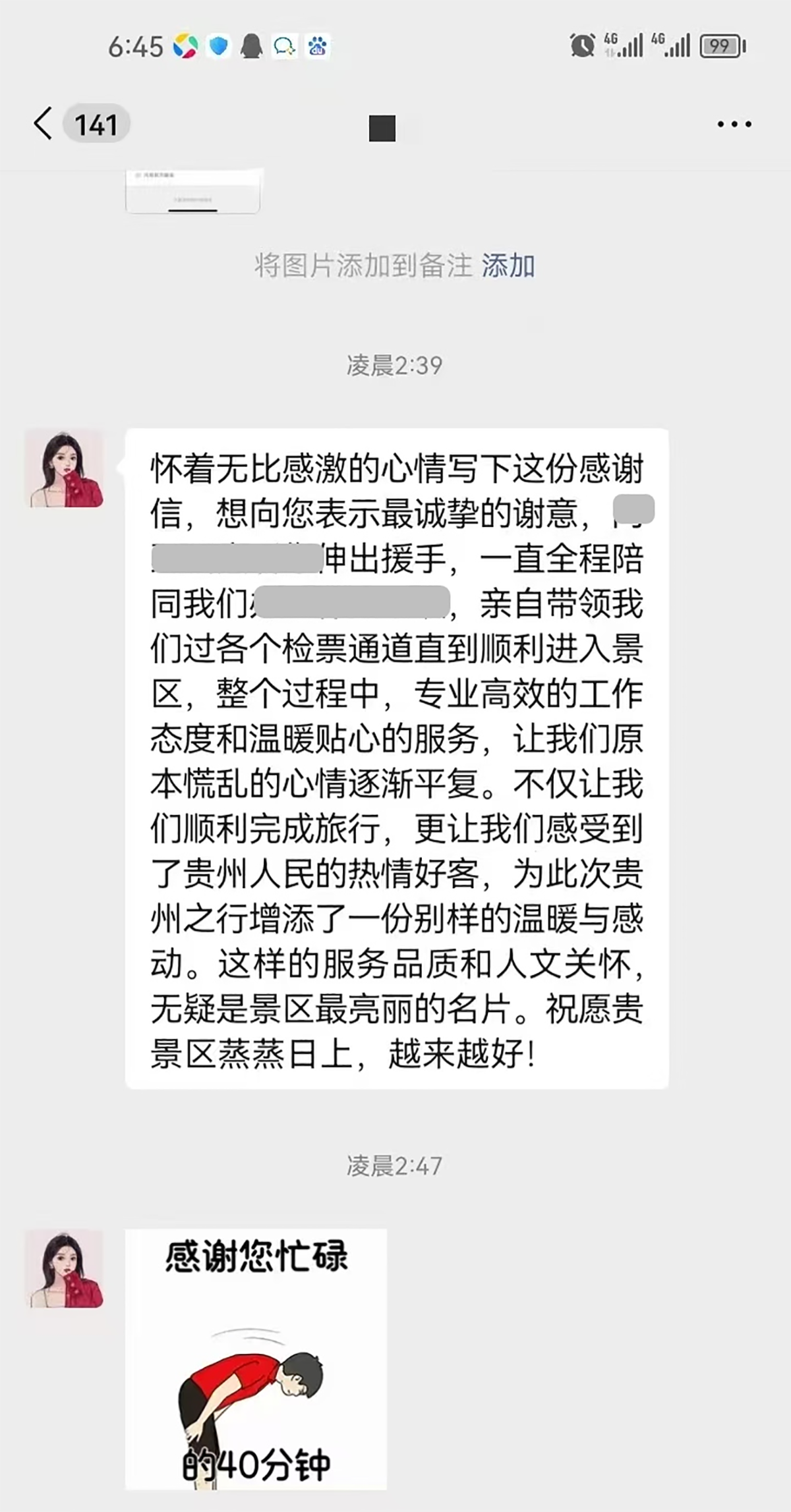 在五一期间的西江千户苗寨景区,不仅有美丽的风景和精彩的活动,还有许多温暖人心的好人好事。景区相关工作人员时刻关注着游客的需求,为游客提供及时、周到的帮助。答疑解惑、贴心指引、有序引导、安全普及,失物招领,积极为游客寻回多件手机、身份证、水壶、手提包等丢失物品,及时为游客提供紧急医疗帮助……一件件暖心事迹的上演,反映了景区优质的旅游服务水平,工作人员在平凡的岗位上始终如一践行“游客至上”理念,用实际行动传递有温度的服务,获得了游客的广泛认可和好评。展现了景区良好的精神风貌和人文关