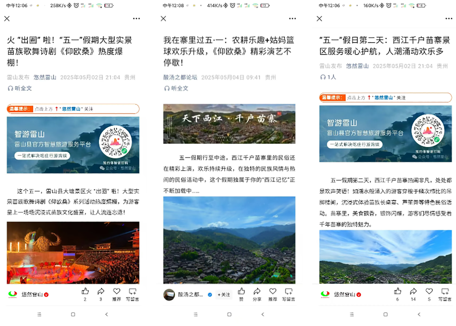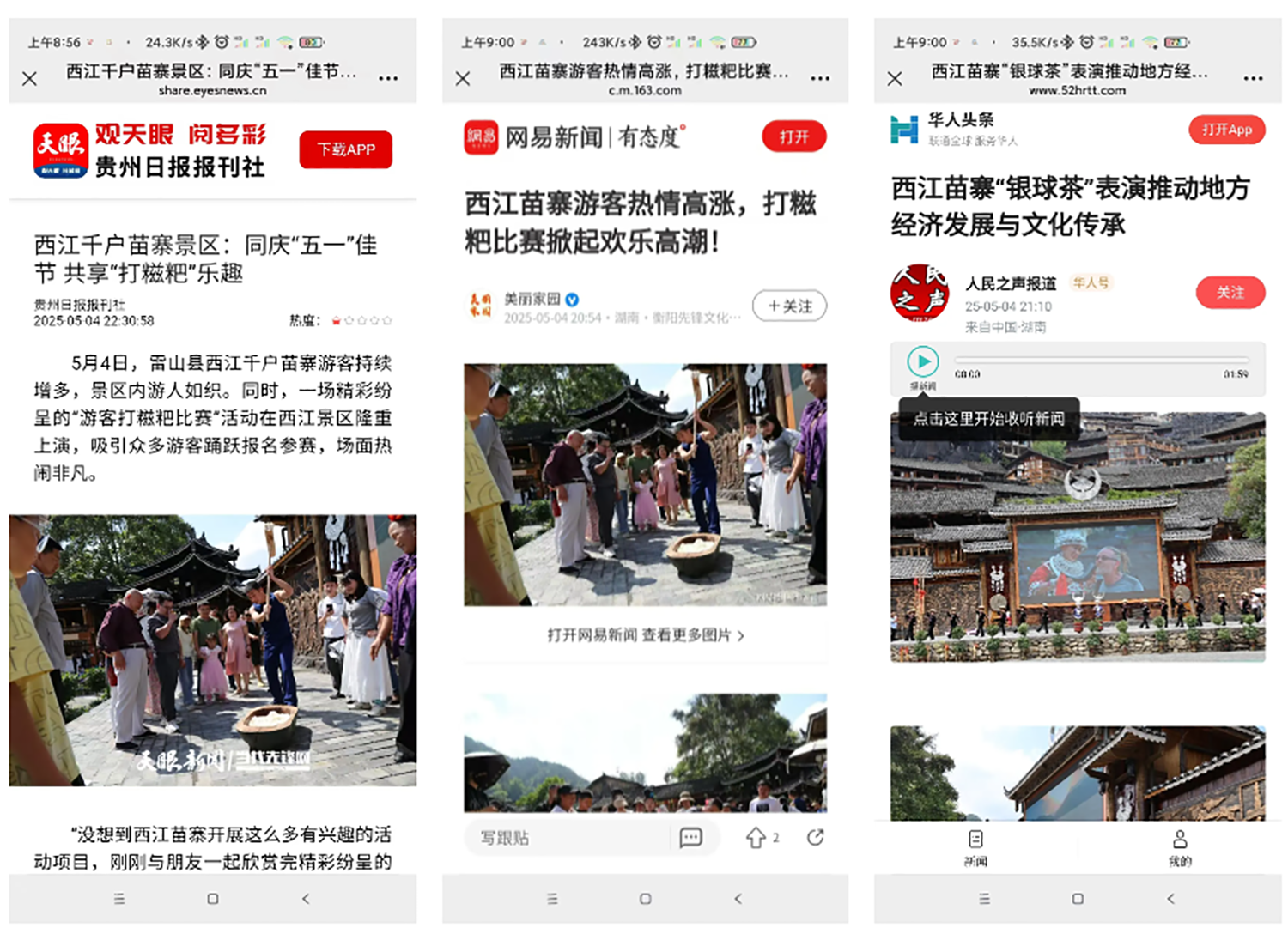 西江千户苗寨五一期间的火爆景象吸引了众多媒体的关注,让苗寨的知名度大幅提升。对景区的民俗活动、旅游服务、游客体验等方面进行了全方位的报道,向全国观众展示了西江千户苗寨独特的苗族文化和有温度、高质量的旅游服务工作。此外,各大网络媒体、社交媒体也纷纷对西江千户苗寨进行报道和分享,让西江千户苗寨成为了五一期间的热门旅游打卡地。