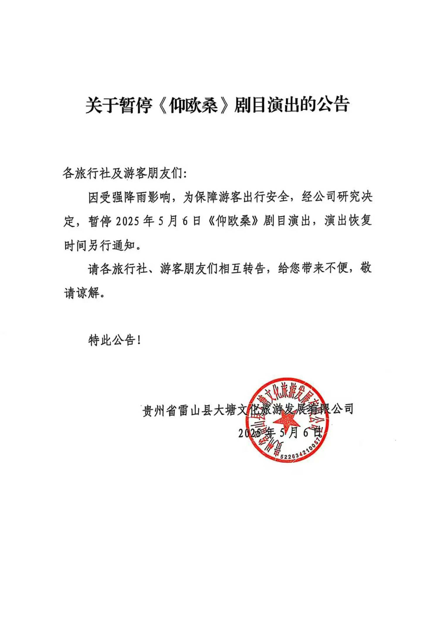 关于暂停《仰欧桑》剧目演出的公告