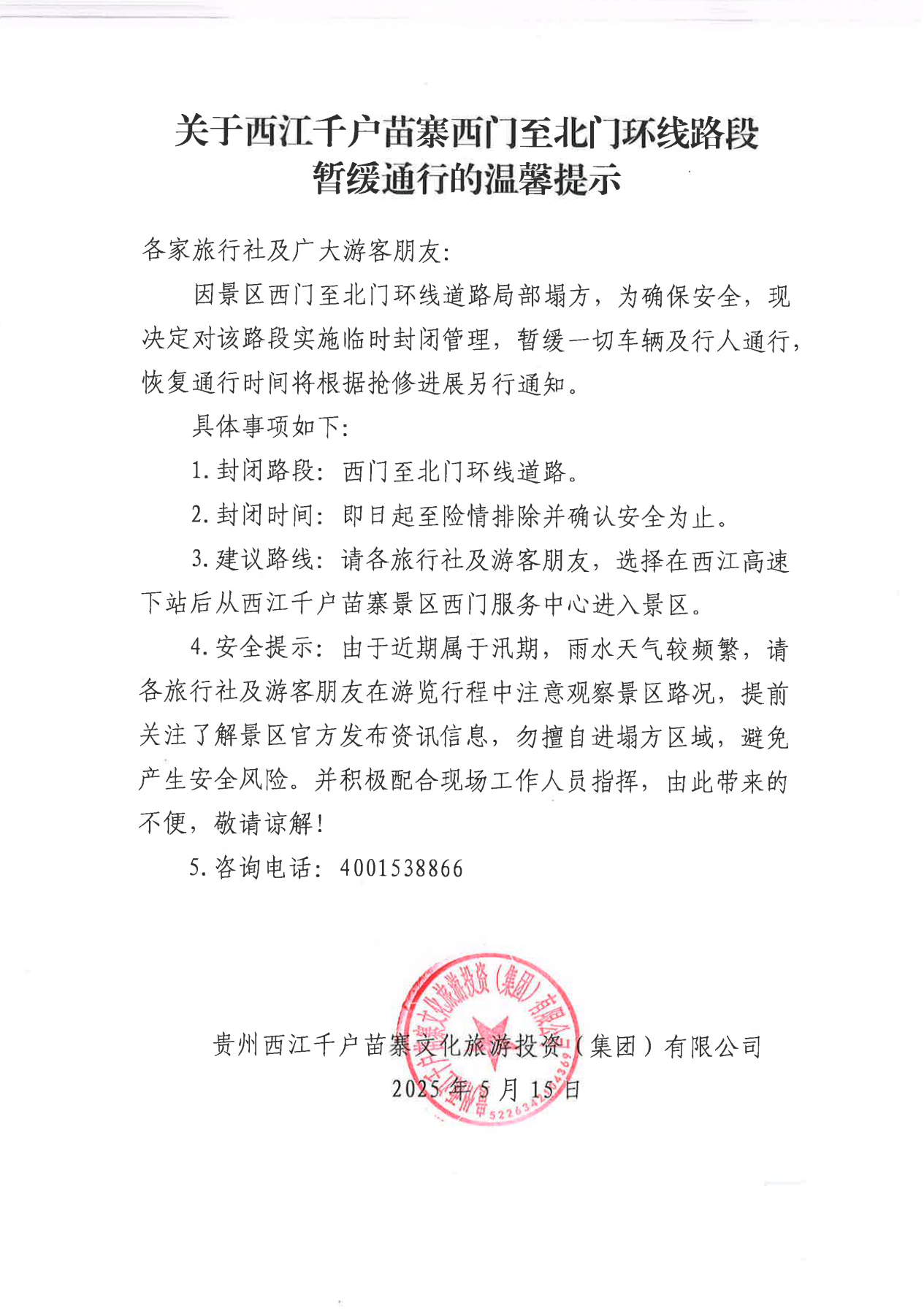 关于西江千户苗寨西门至北门环线路段暂缓通行的温馨提示