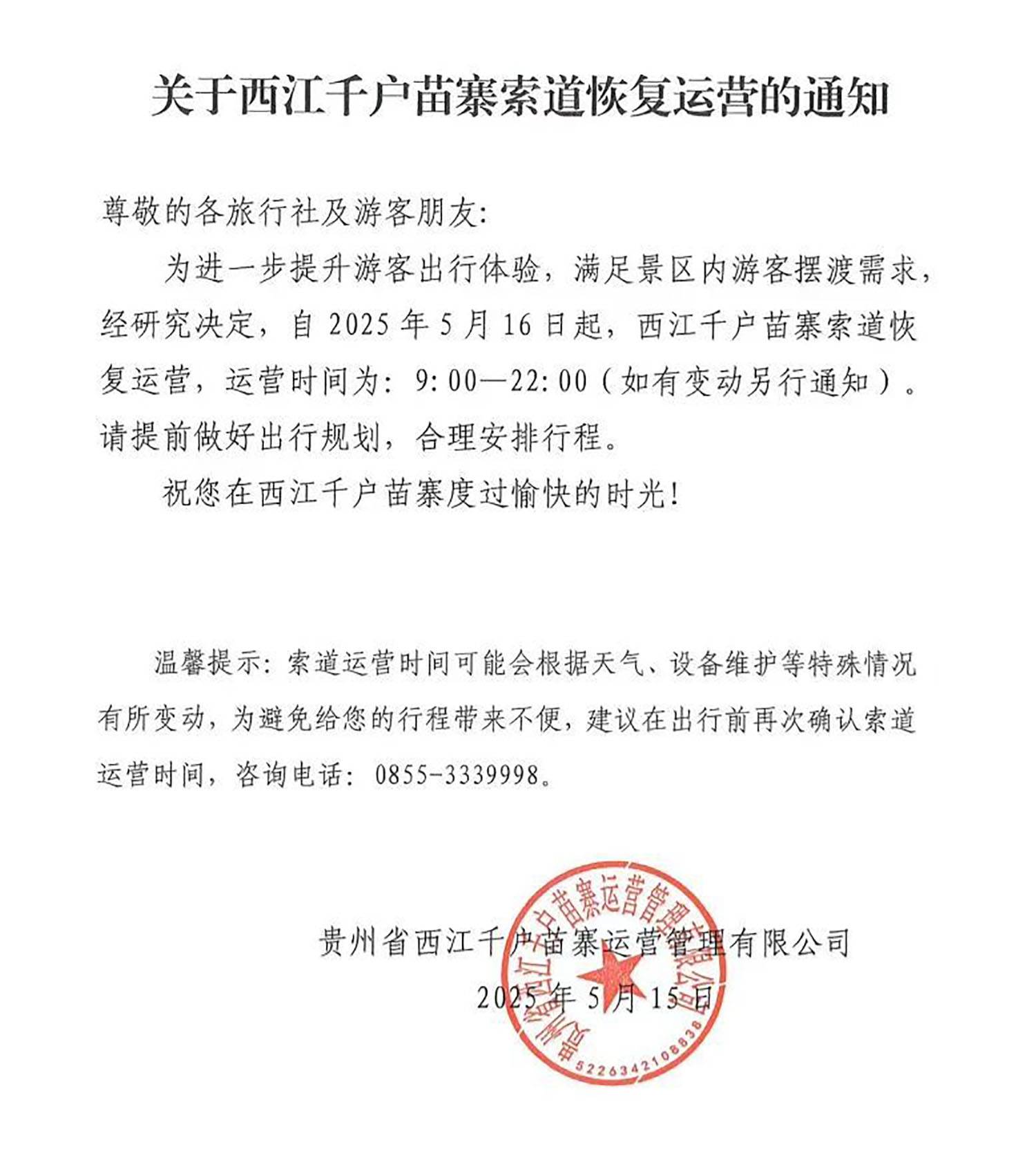 关于西江千户苗寨索道恢复运营的通知