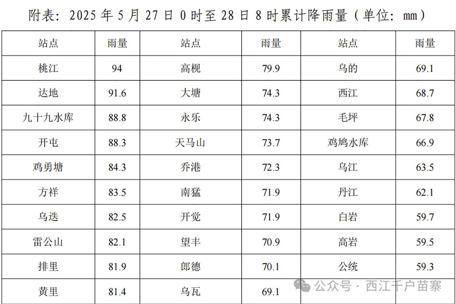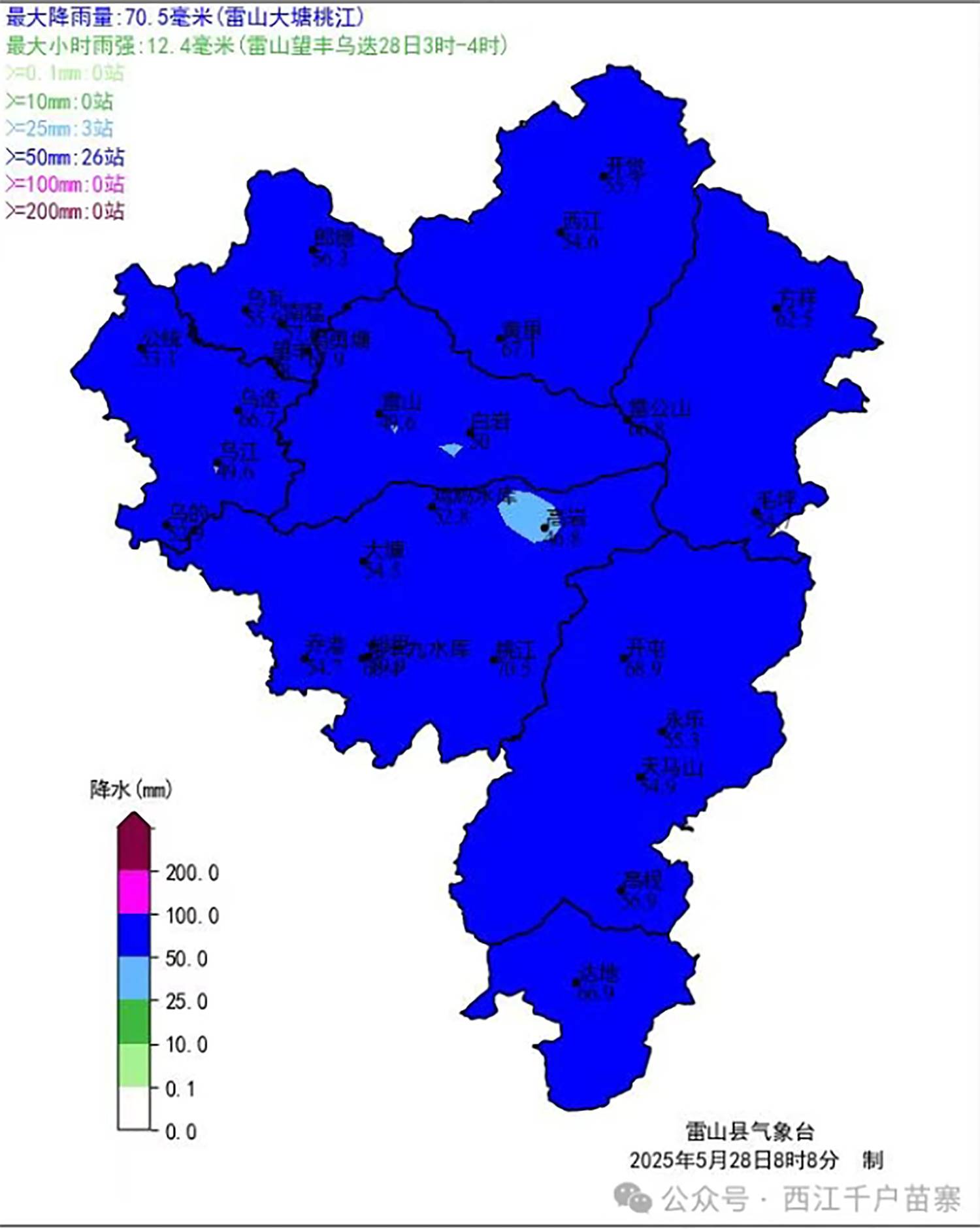 雷山县气象局27 日0时至28日8时全县累计降雨量均超过 50mm