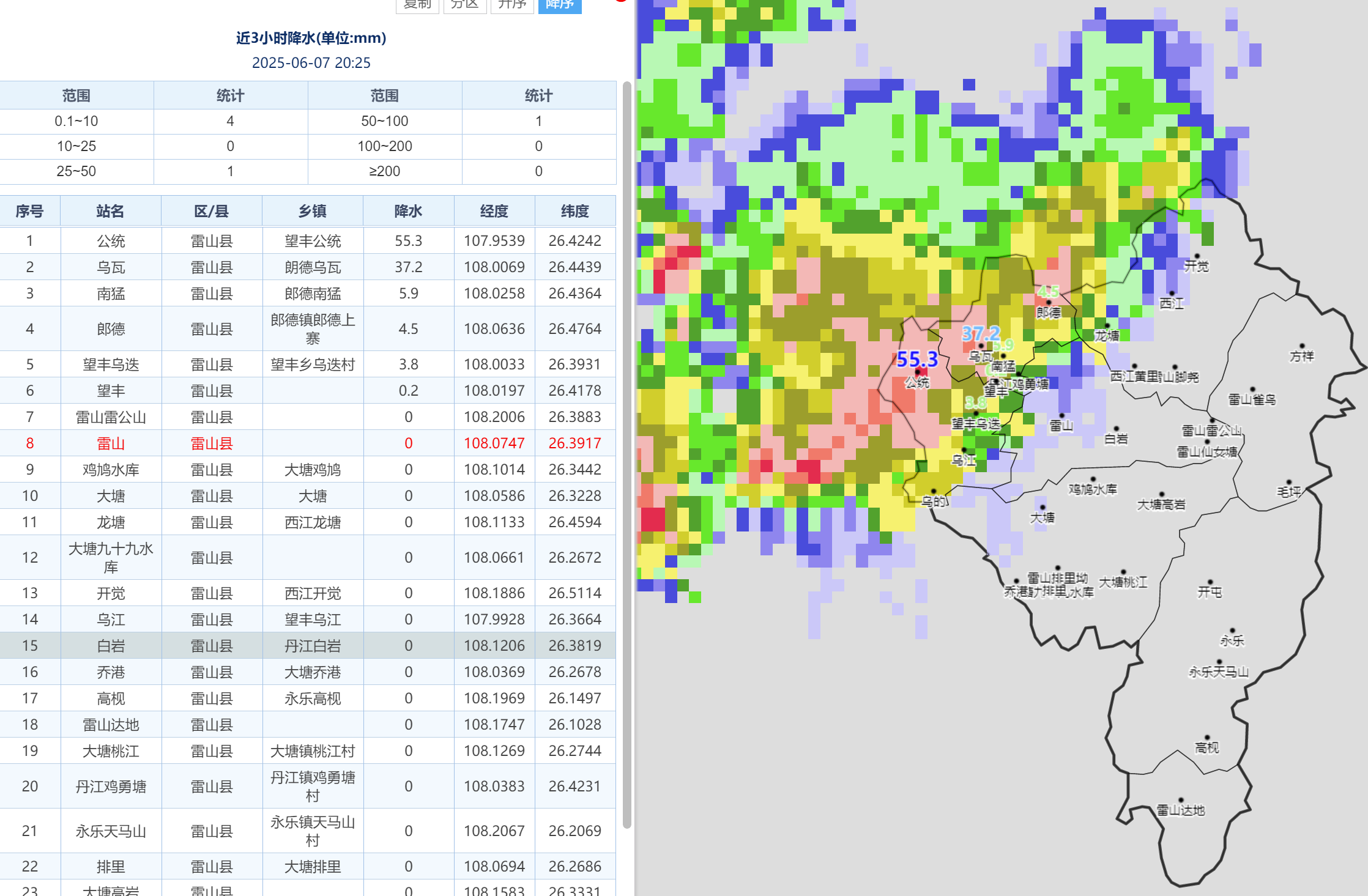 雷山县气象台2025年6月7日20时15分发布暴雨黄色预警信号:预计未来6小时我县丹江、望丰、西江、郎德等乡镇降雨量将达50毫米以上,且降雨持续,请注意防范。