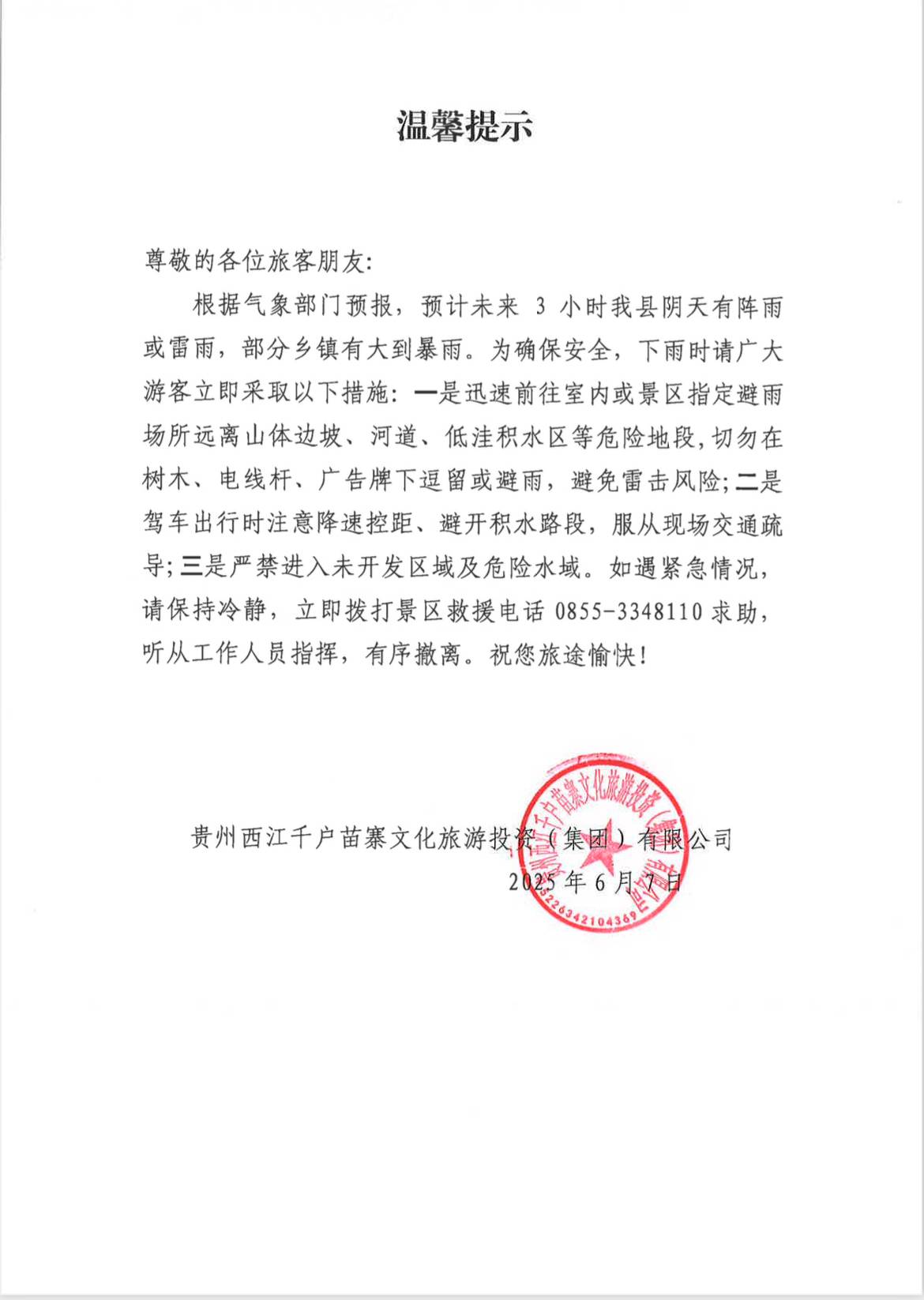 根据气象部门预报,预计未来 3 小时我县阴天有阵雨或雷雨,部分乡镇有大到暴雨。为确保安全,下雨时请广大游客立即采取以下措施:一是迅速前往室内或景区指定避雨场所远离山体边坡、河道、低洼积水区等危险地段,切勿在树木、电线杆、广告牌下逗留或避雨,避免雷击风险;二是驾车出行时注意降速控距、避开积水路段,服从现场交通疏导;三是严禁进入未开发区域及危险水域。如遇紧急情况,请保持冷静,立即拨打景区救援电话0855-3348110求助,听从工作人员指挥,有序撤离。祝您旅途愉快!