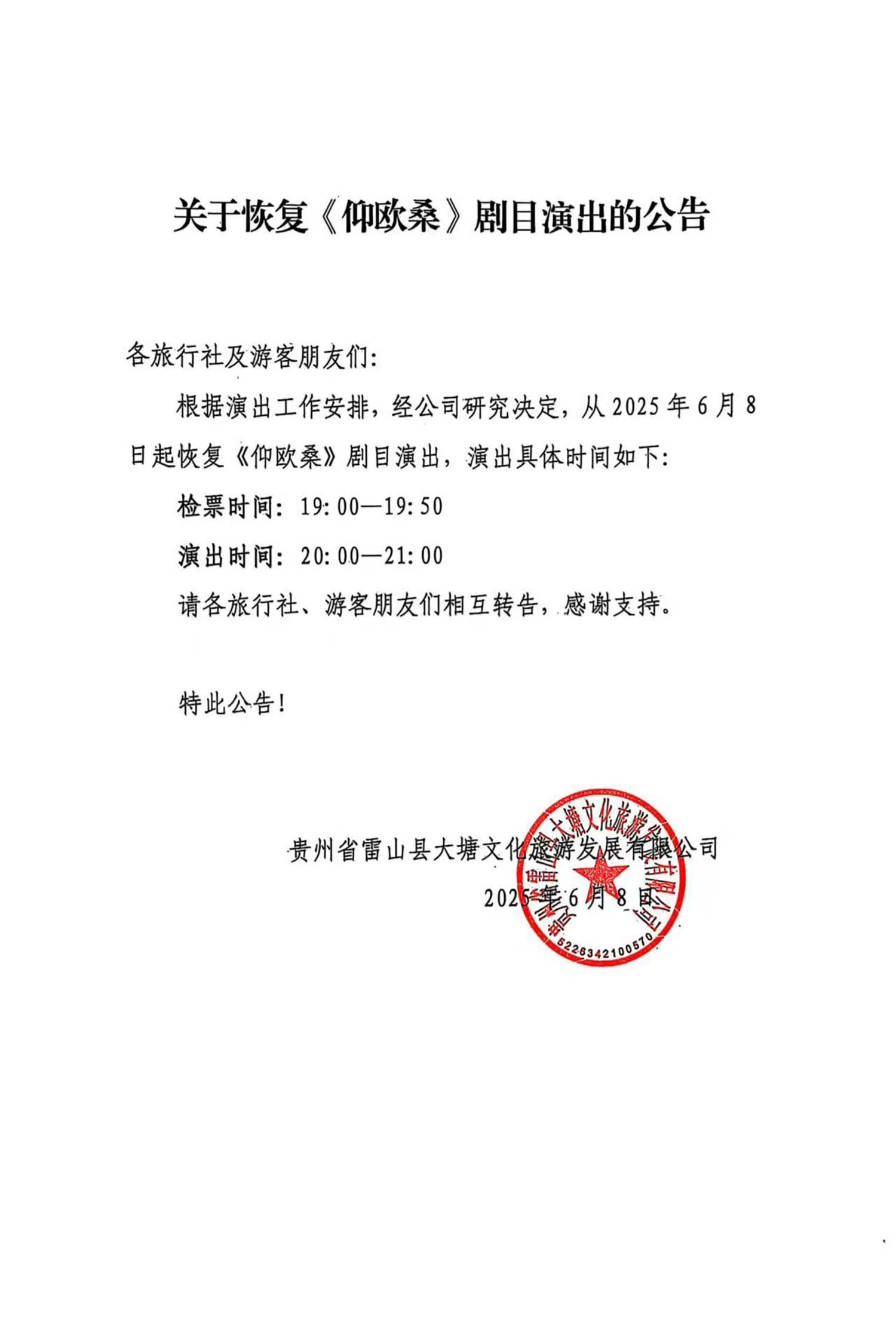 关于大型实景苗族歌舞诗剧《仰欧桑》演出恢复的公告