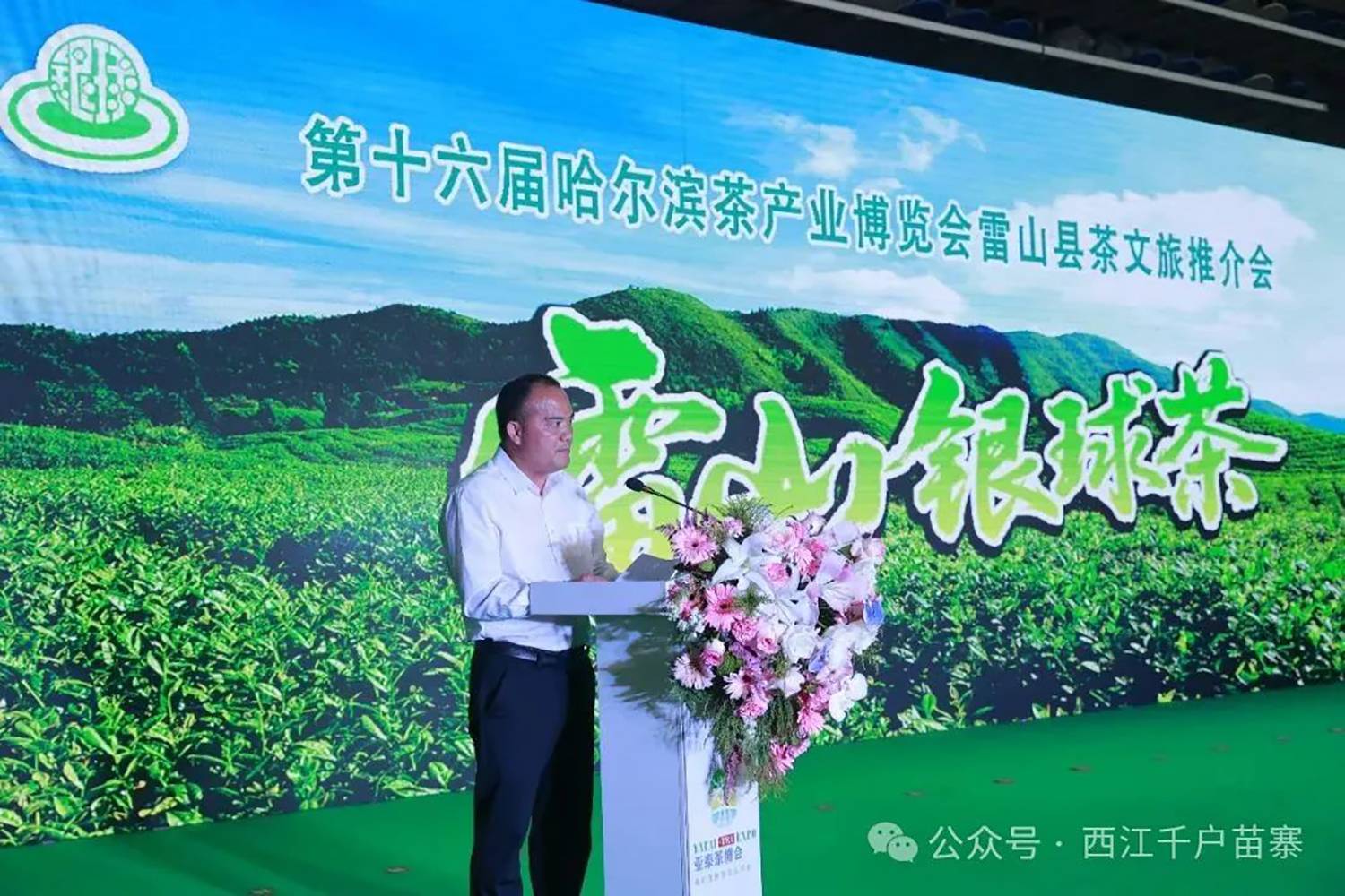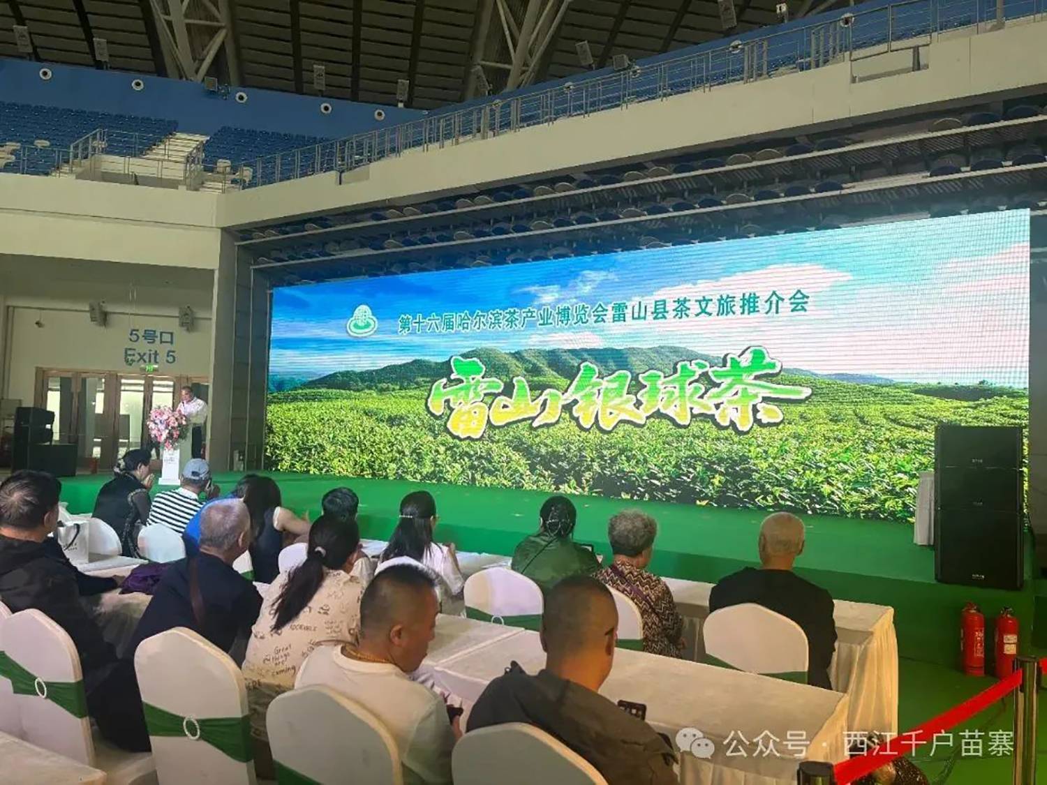 此次第十六届哈尔滨产业博览会雷山县茶文旅推介会上,介绍了地理标志产品雷山银球茶,其造型独特,采用雷公山国家级自然保护区腹地海拔1200米至1600米的生态茶园优质鲜叶茶青为原料,经“摊青—杀青—揉捻—回炒—造型—烘干—提香”的工艺加工而成的直径18-20毫米的球体特形茶,约重2.5克,内含丰富的氨基酸、茶多酚等元素。