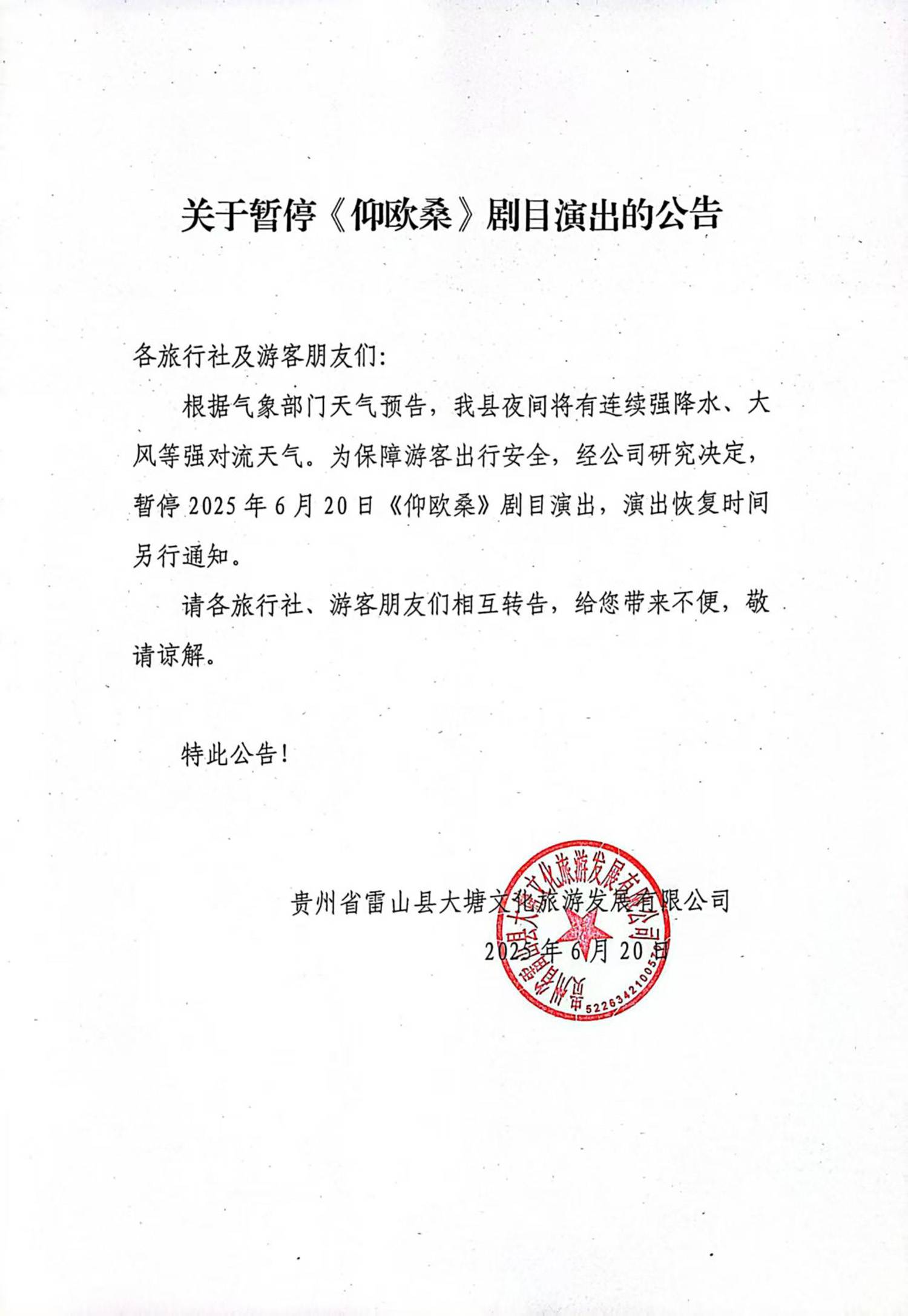 关于暂停《仰欧桑》剧目演出的公告
