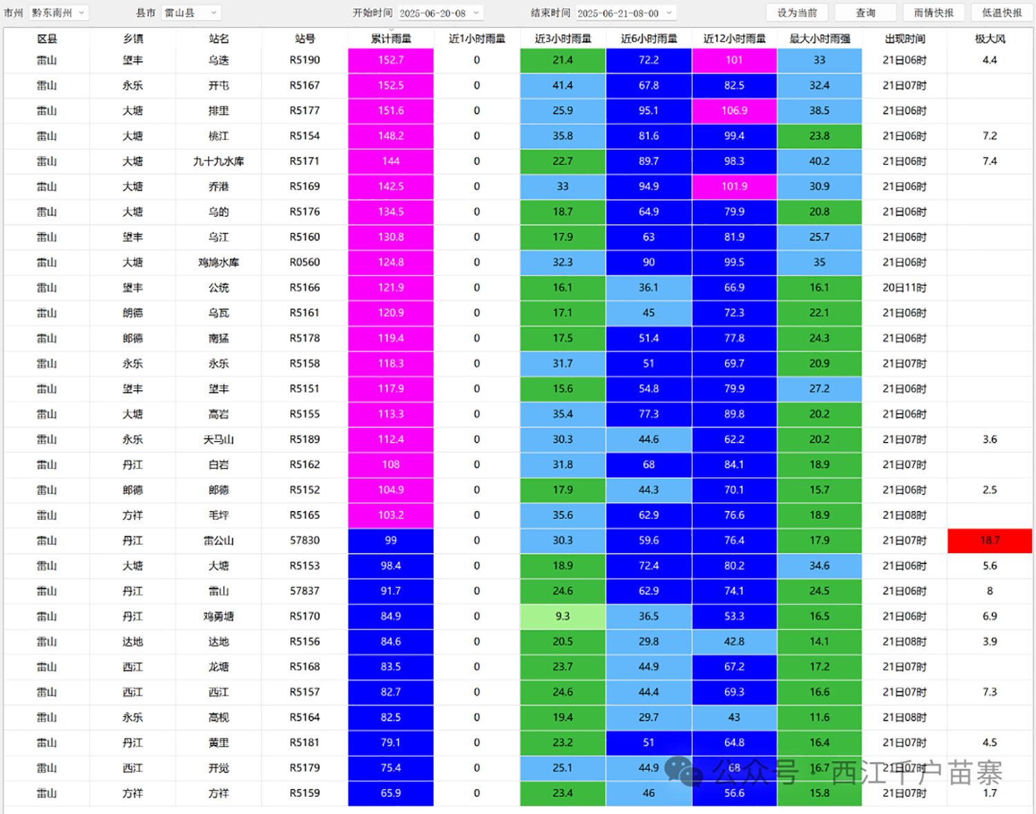 雷山县气象台2025年6月21日8时25分将暴雨黄色预警信号升级为暴雨橙色预警信号:预计未来3小时我县望丰、大塘、永乐等乡镇降雨量将达到100毫米以上,请注意防范,警惕危险区域,合理安排出游时间!