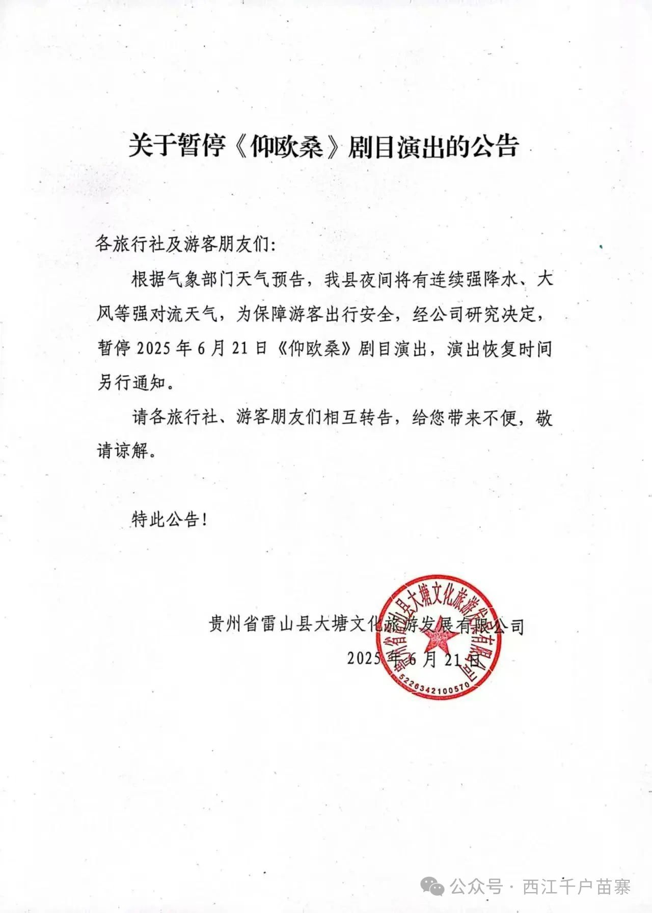 关于暂停《仰欧桑》剧目演出的公告