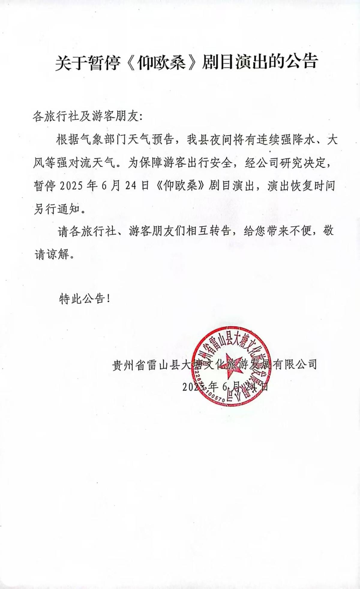 关于暂停《仰欧桑》剧目演出的公告