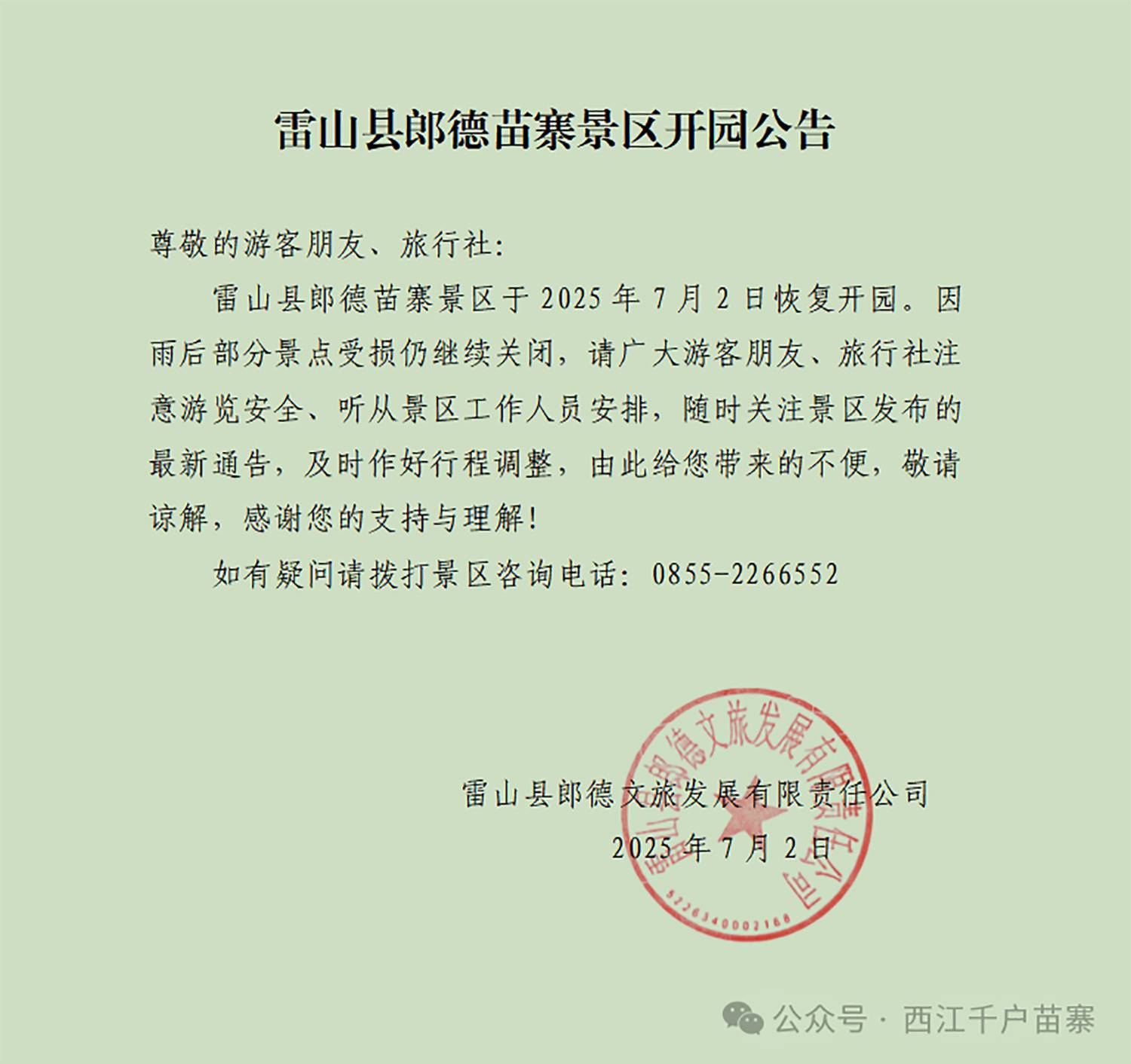 雷山县郎德苗寨景区开园公告