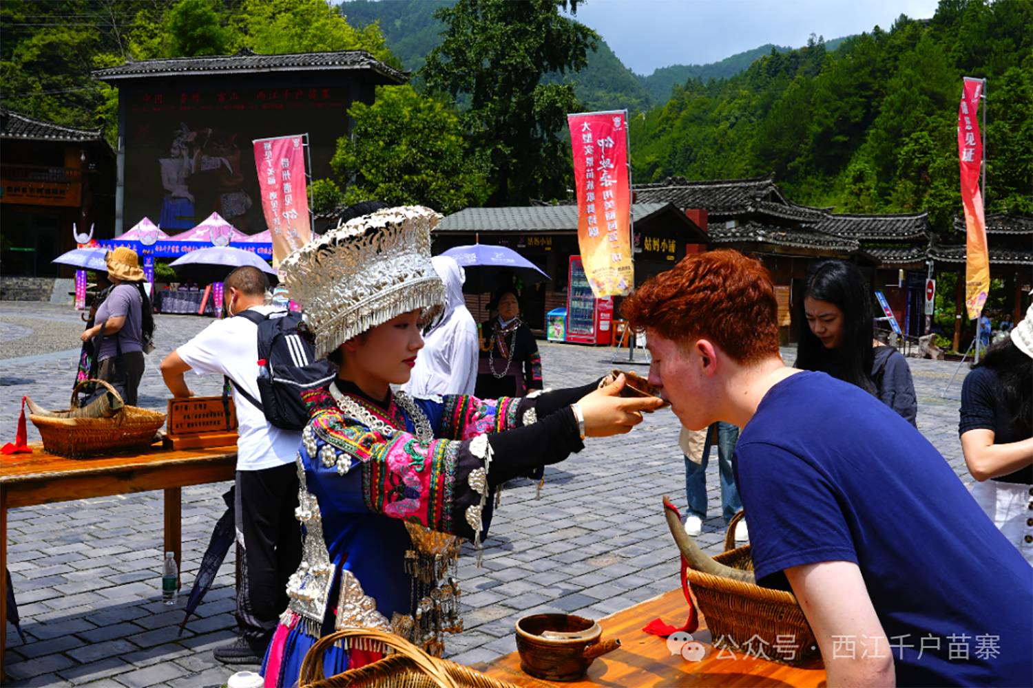 刚入寨,芦笙声起,米酒飘香。苗家阿哥阿妹便用最有温度的“入场曲”,最高礼仪的“十二道拦门酒”欢迎远道而来的客人,牛角杯里盛满热忱,甘醇米酒入喉,每一道酒都蕴含着苗乡人民的热情与祝福,让此行的欧洲音乐人深切感受到苗族文化的厚重与温度。