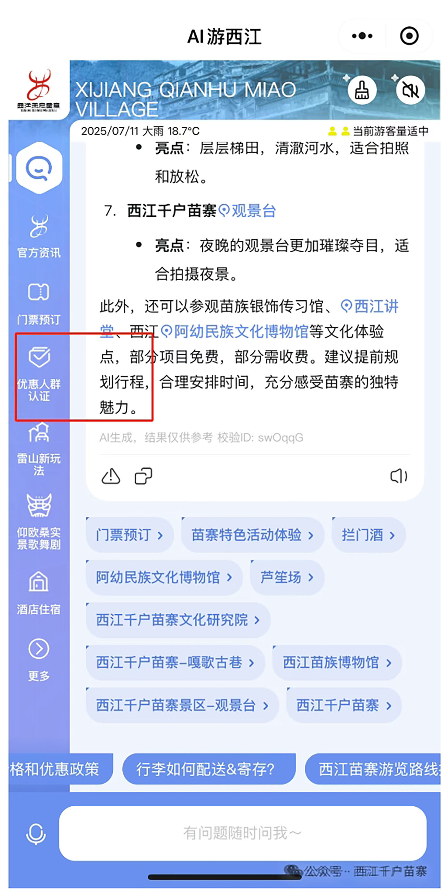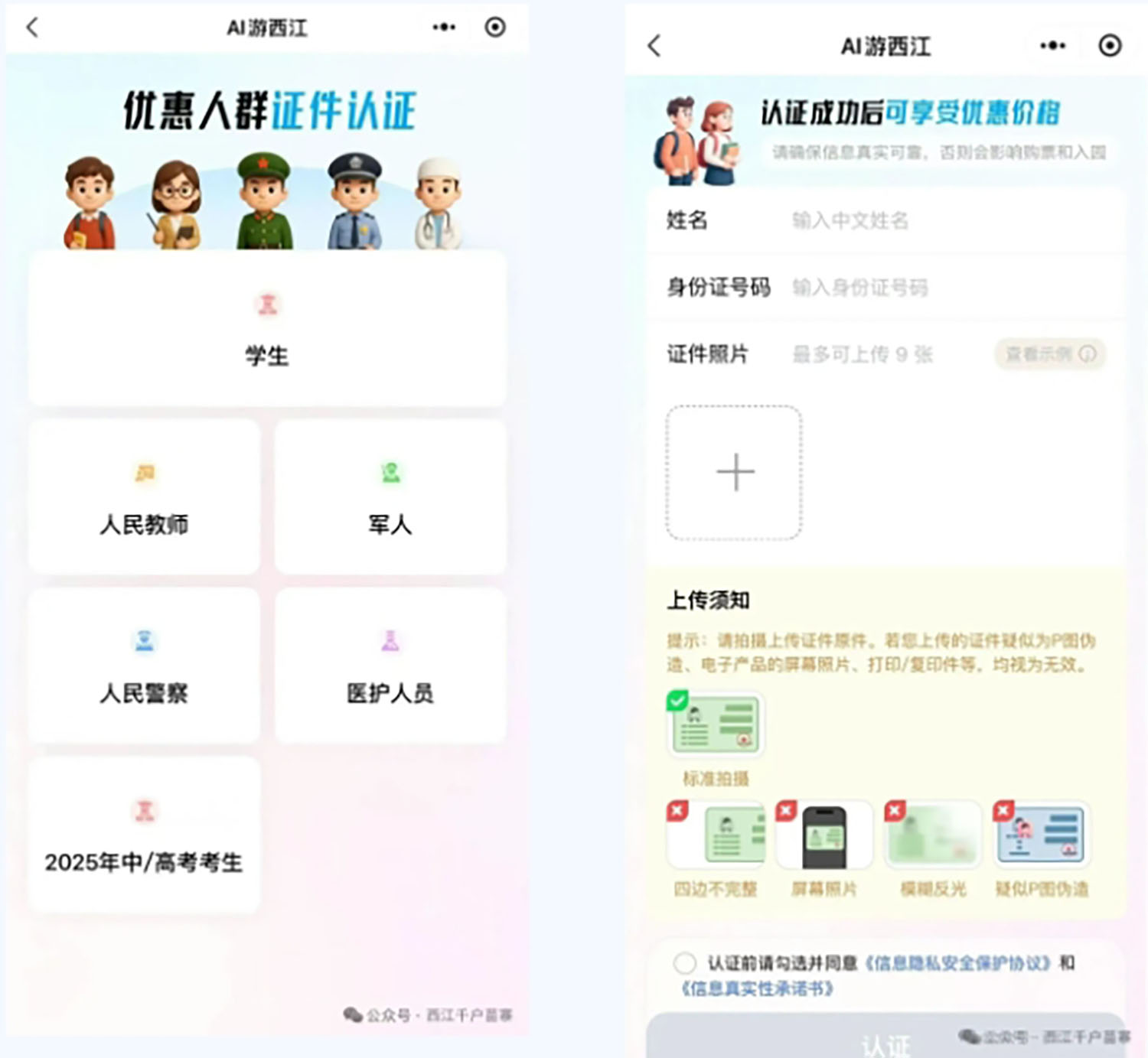 01打开微信扫下方二维码进入小程序或者微信搜索”AI游西江“小程序并关注,点击”优惠人群认证“专栏即可进入认证通道