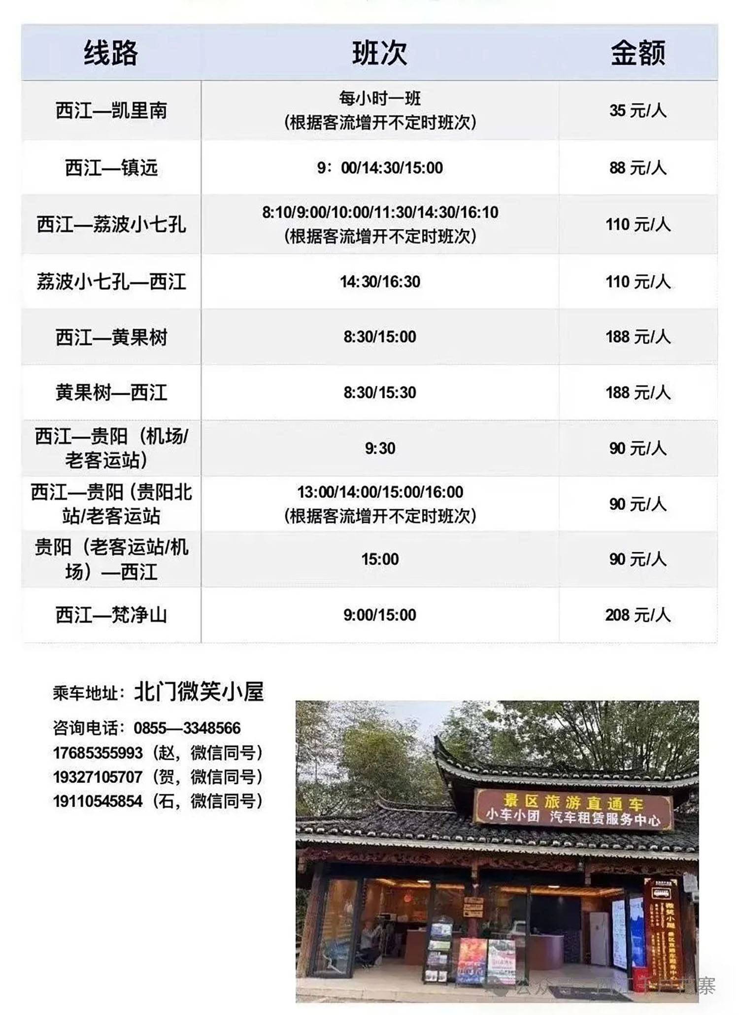 黔东南首府凯里及雷山均有到西江千户苗寨的客车,分别在凯运司、雷山汽车站乘坐。