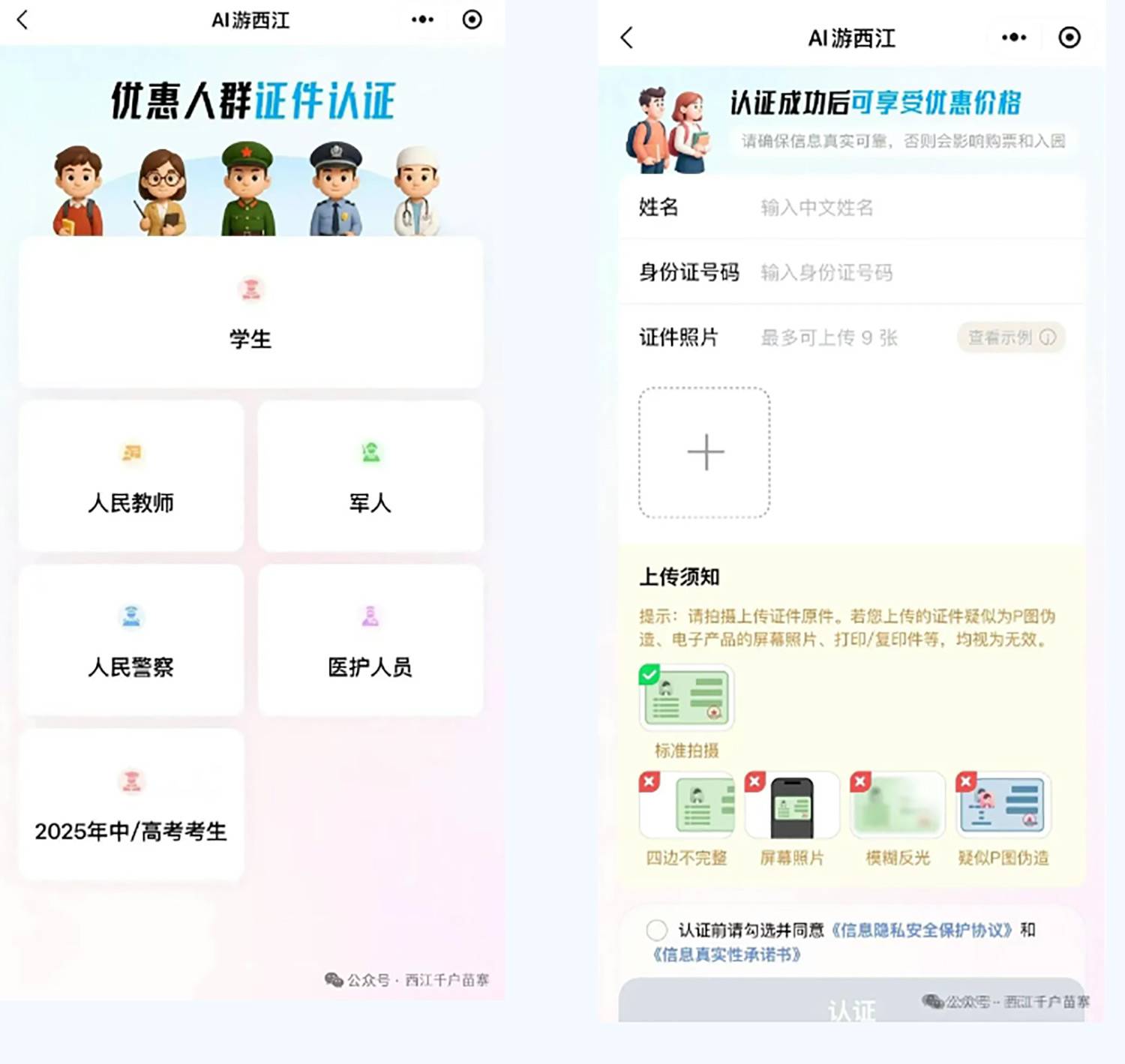 02特殊证件办理:针对享受门票优惠政策的特殊证件(包括军官证、记者证、残疾证等免票证件,以及学生证、护照、港澳台地区相关证件),可通过线上登录“AI游西江”或“一码游贵州”平台,上传相关证件完成认证后购票或线下携带有效证件前往现场窗口直接办理免票手续。