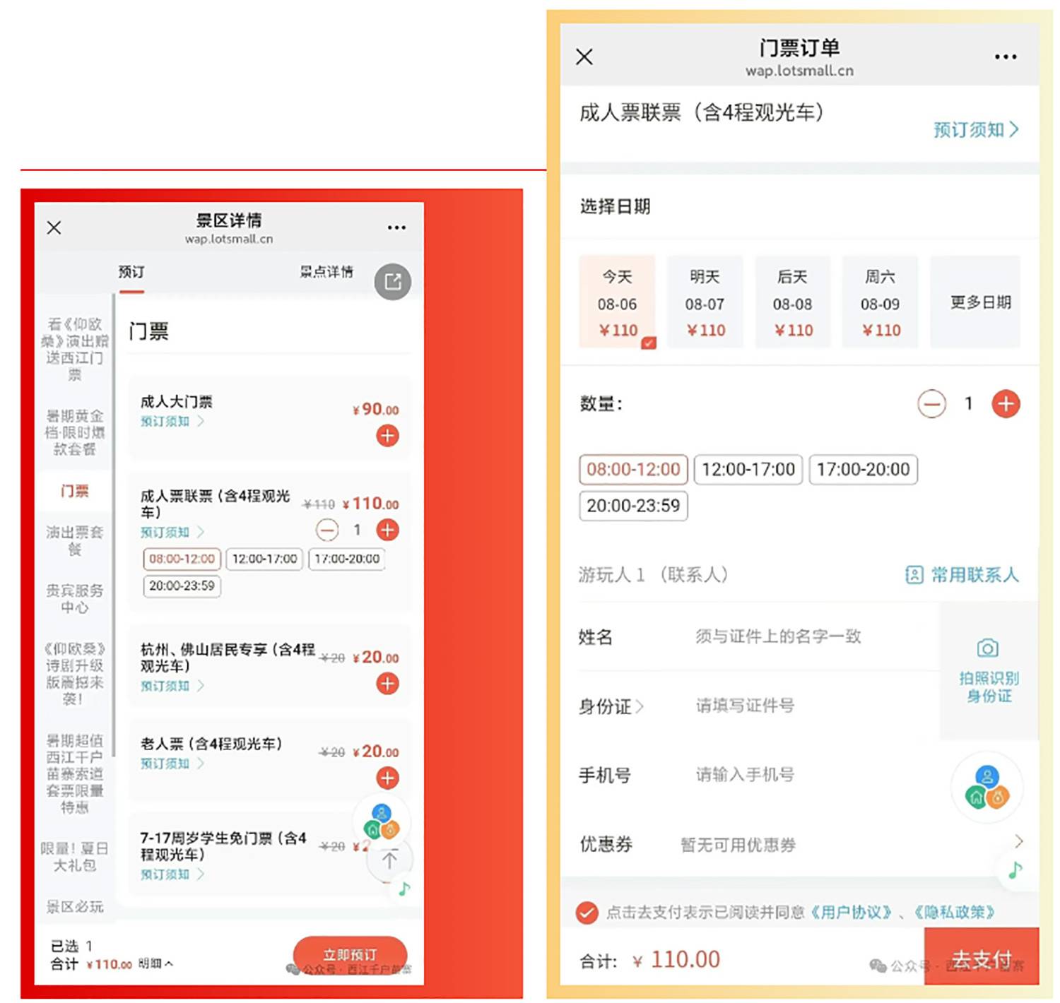 01分时预约:游客需提前通过线上实名制分时预约购票,分时预约时段分为四个时段:8:00-12:00、12:00-17:00、17:00-20:00、20:00-23:59,购票时需一人一证;建议游客提前一天预约购买景区门票+观光车票,预约购票成功后请在预约时间段内刷身份证入园(温馨提示:在预约时间段时请考虑交通、排队等因素)。如购票异常请联系客服电话:400-153-8866。
