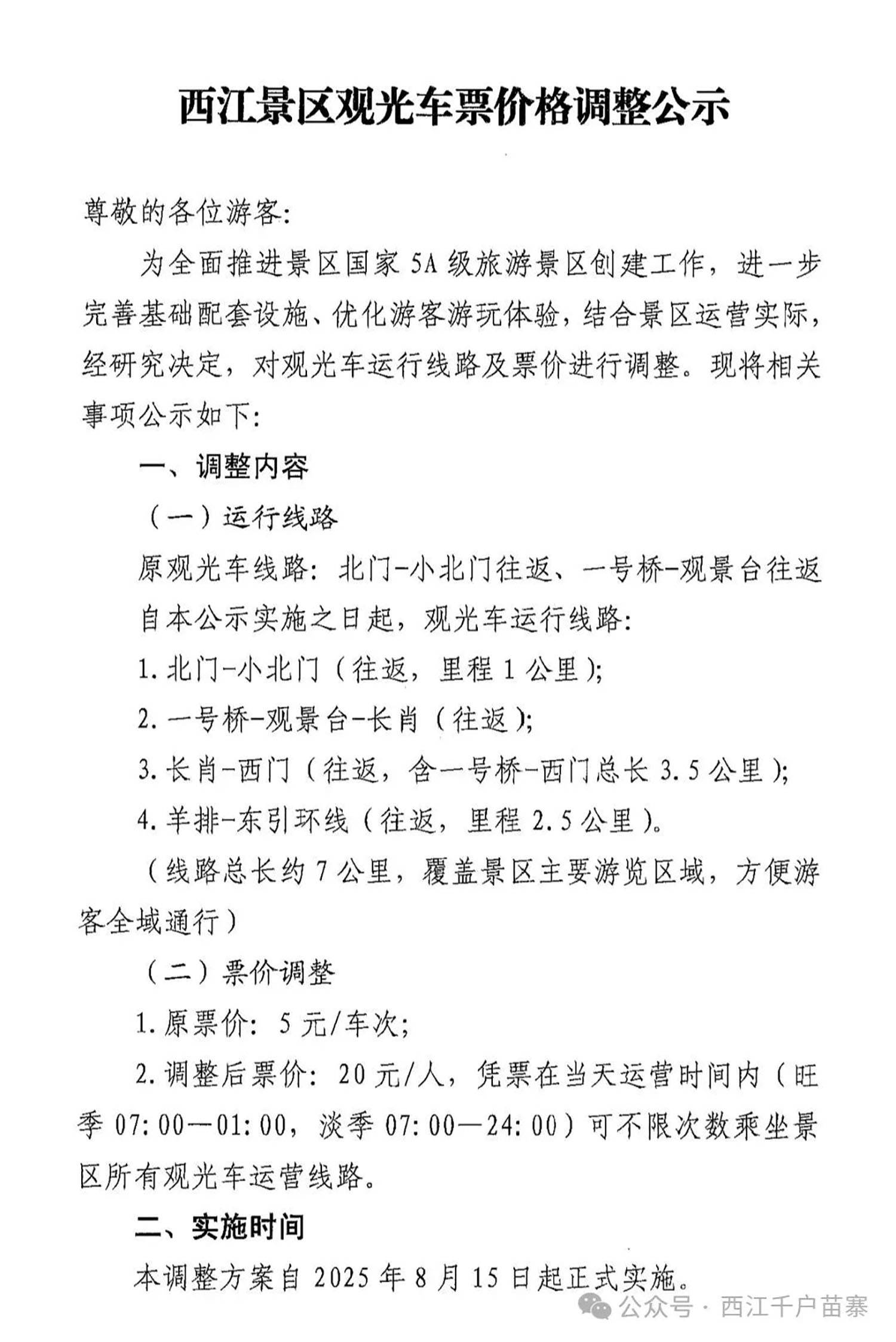 西江景区观光车票价格调整公示